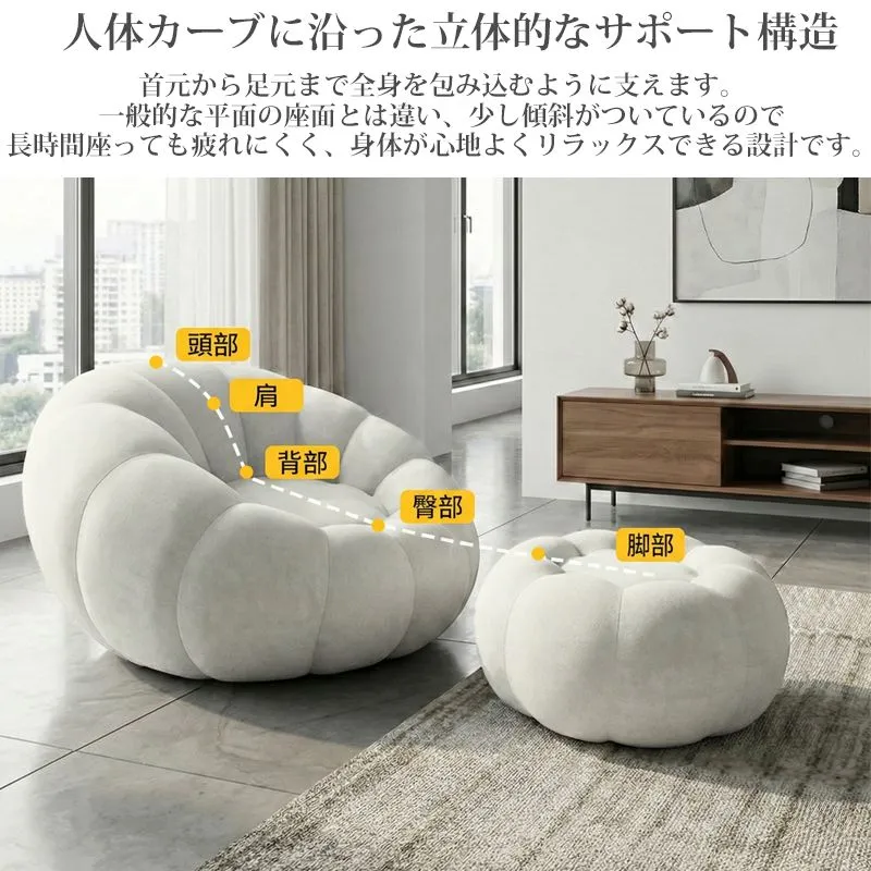 体全体を包み込むようなフィット感が特徴、アームなしで圧迫感を感じずに開放感を与えます。
