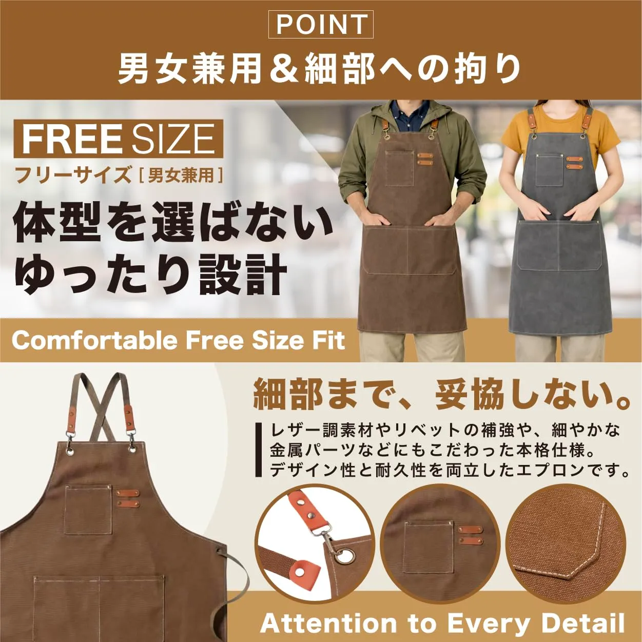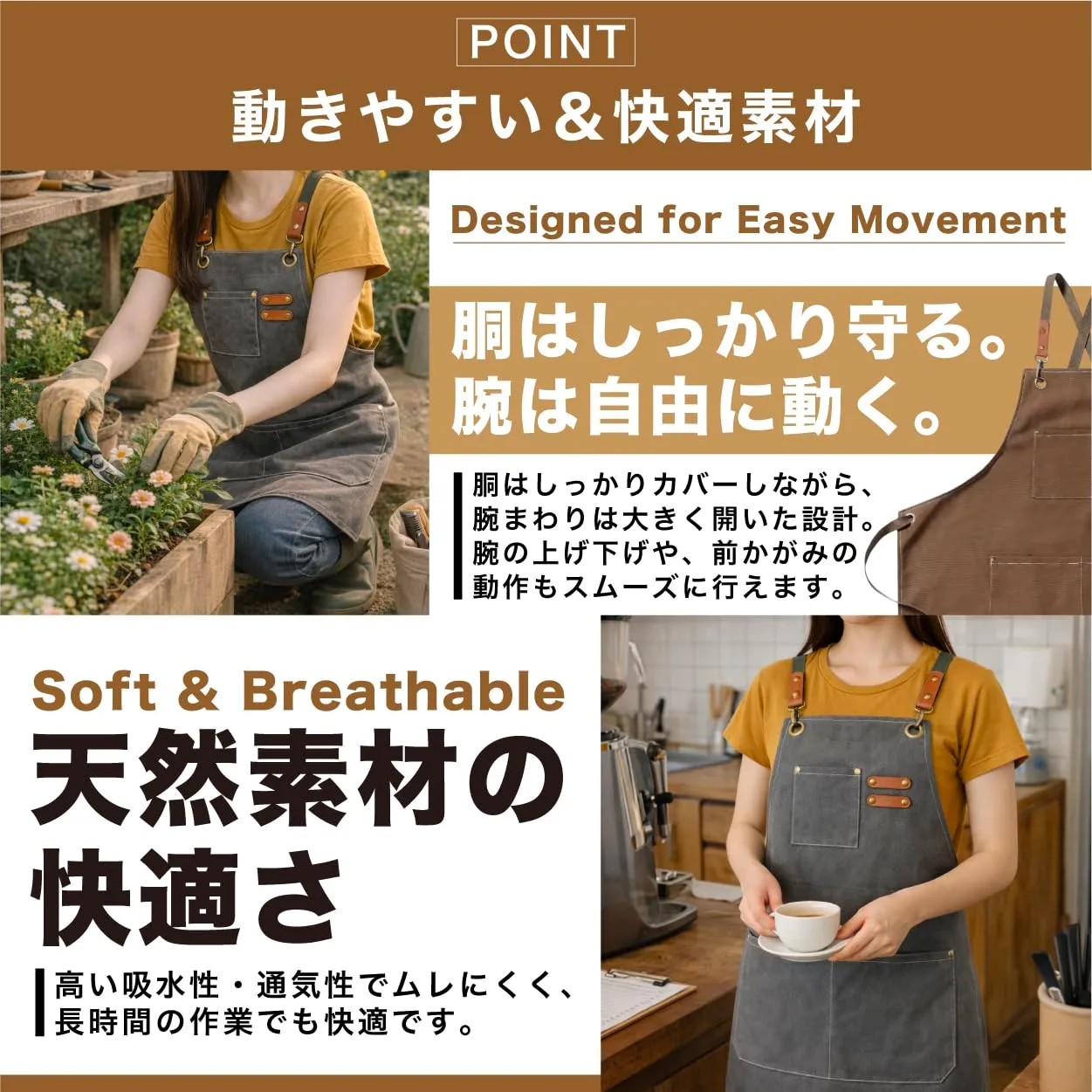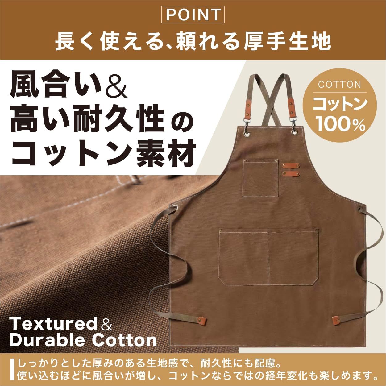 【素材】 本商品は、コットン100%(綿100%)素材を使用したエプロンです。 天然素材ならではのやさしい肌触りと高い吸水性・通気性が特徴で、長時間の作業でも快適に着用できます。