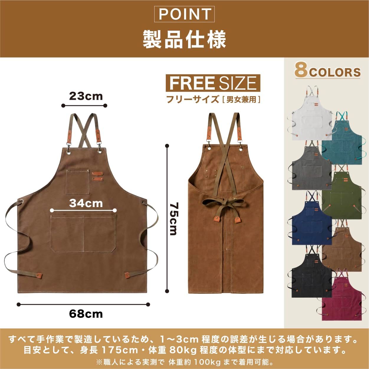 【サイズ】 フリーサイズ(着丈:75cm/身幅:68cm/首元幅:23cm/ポケット幅:34cm) すべて手作業で製造しているため、1〜3cm程度の誤差が生じる場合があります。 目安として、身長175cm・体重80kg程度の体型にまで対応しています。※職人による実測で 体重約100kgまで着用可能。