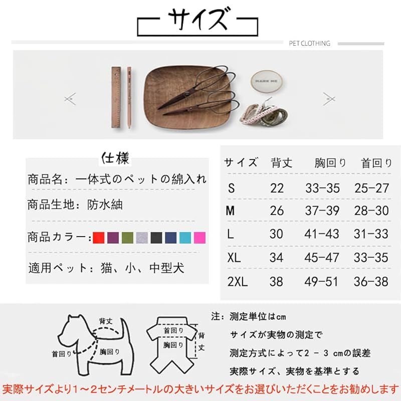 【仕様】: 商品名:一体式のペットの綿入れ 素材:綿、防水紬 色:青、赤、緑、黒、パープル、ピンク、スカイブルー サイズ: S:背丈 22cm 胸回り36cm 首回り25cm M:背丈 26cm 胸回り40cm 首回り28cm L:背丈 30cm 胸回り44cm 首回り31cm XL:背丈 34cm 胸回り48cm 首回り34cm 2XL:背丈 38cm 胸回り52cm 首回り37cm パッケージに含まれるもの: 1×一体式のペットの綿入れ 5色選べる、きれいで暖かく、ペットの体を保護しています。 上質な防水生地を厳選し、雨の日も心配なし。 ハーネスと上手に結ばれた綿入れ、一体型のデザインがより美しく、快適で便利。 ファスナー式のデザインで着脱が楽に簡単になるので、ペット連れでお出かけしましょう。 テカリ素材を使用し、夜の散歩時の安全性を高めた。 適用ペット:猫、小型犬、中型犬に適用する。 注): 1、ペットの首周り、胴回り、背中を測って、サイズ表をご確認の上お買い求めください。 2、実際サイズより1~2センチメートルの大きいサイズをお選びいただくことをお勧めします。 3、手計りのため1~2cmの誤差は予めご了承ください。 4、写真の色調はご使用のモニターの機種や設定により実際の商品と異なる場合がございます。