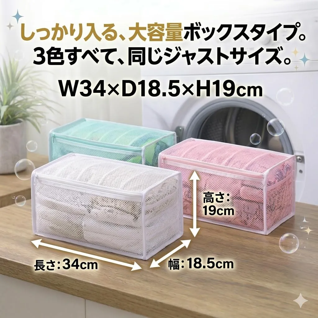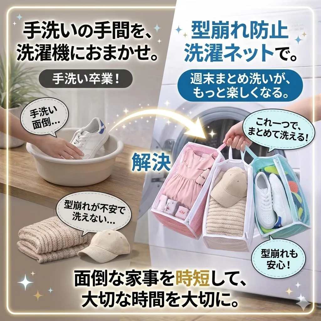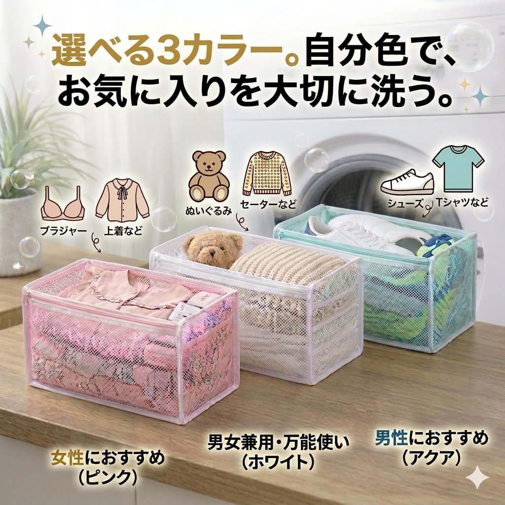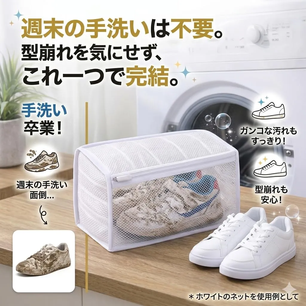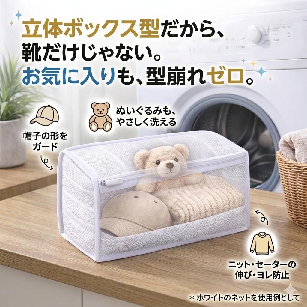 【立体構造で型崩れを防ぐ】 自立するボックス型構造により、洗濯中の押しつぶれや変形を軽減。靴だけでなく、帽子・ぬいぐるみ・セーターなど形を保ちたい洗濯物にも安心して使用できます。