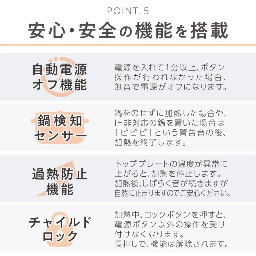 ■安心・安全設計 火を使わないIH方式を採用。 チャイルドロック、自動電源オフ、鍋検知センサー、過熱防止機能など、安全面にも配慮されています。