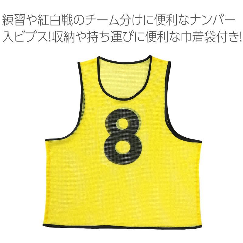 ■完成サイズ:Fサイズ(身丈:約610mm、身幅:約560mm) チーム分けに便利なナンバー入りビブス10枚セットです。両面に1~10の番号が入っており、視認性の高いカラーで遠くからでも識別しやすく、体育祭やスポーツイベント、部活動の紅白戦などに便利です。フリーサイズで幅広い方に着用でき、収納や持ち運びに便利な巾着袋付きで管理もしやすい仕様です。 ※お使いのモニター設定、お部屋の照明等により実際の商品と色味が異なる場合がございます