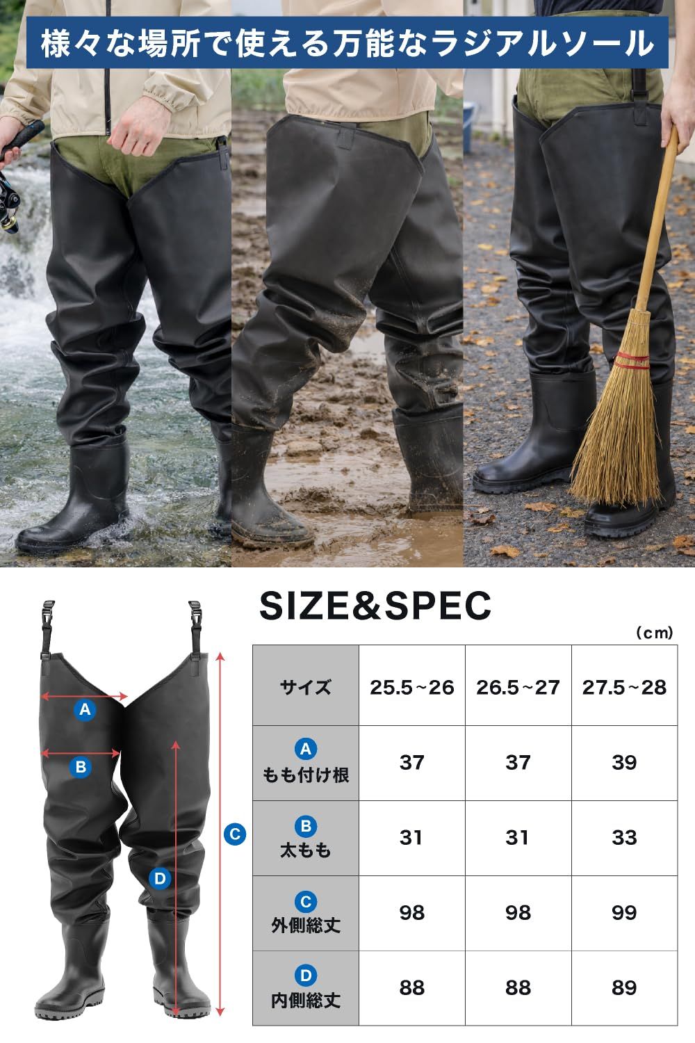 【動きやすい短めブーツと万能ラジアルソール】 足首が動かしやすいよう、しなやかで短めのブーツを採用。足場の悪い現場でも機動力を損ないません。靴底には水捌けが良く軽量な「ラジアルソール(ラバーソール)」を搭載しており、サーフでの釣りから泥地での農作業、清掃まで、様々なフィールドでしっかりとグリップ力を発揮します。✅
