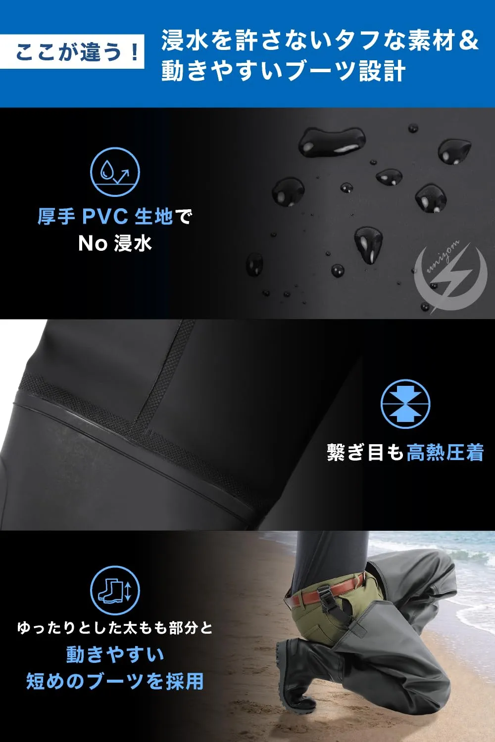 【浸水を許さないタフな厚手PVC素材】 表地には高い防水性と耐摩耗性を誇る厚手のPVC生地を採用し、藪漕ぎや岩場でも破れにくい「タフな耐久性」を実現。さらに、ブーツと生地の繋ぎ目には高熱圧着加工を施すことで、ウェーダーで最も多い浸水トラブルを徹底的に防止し、過酷な環境でもご使用いただけます。✅