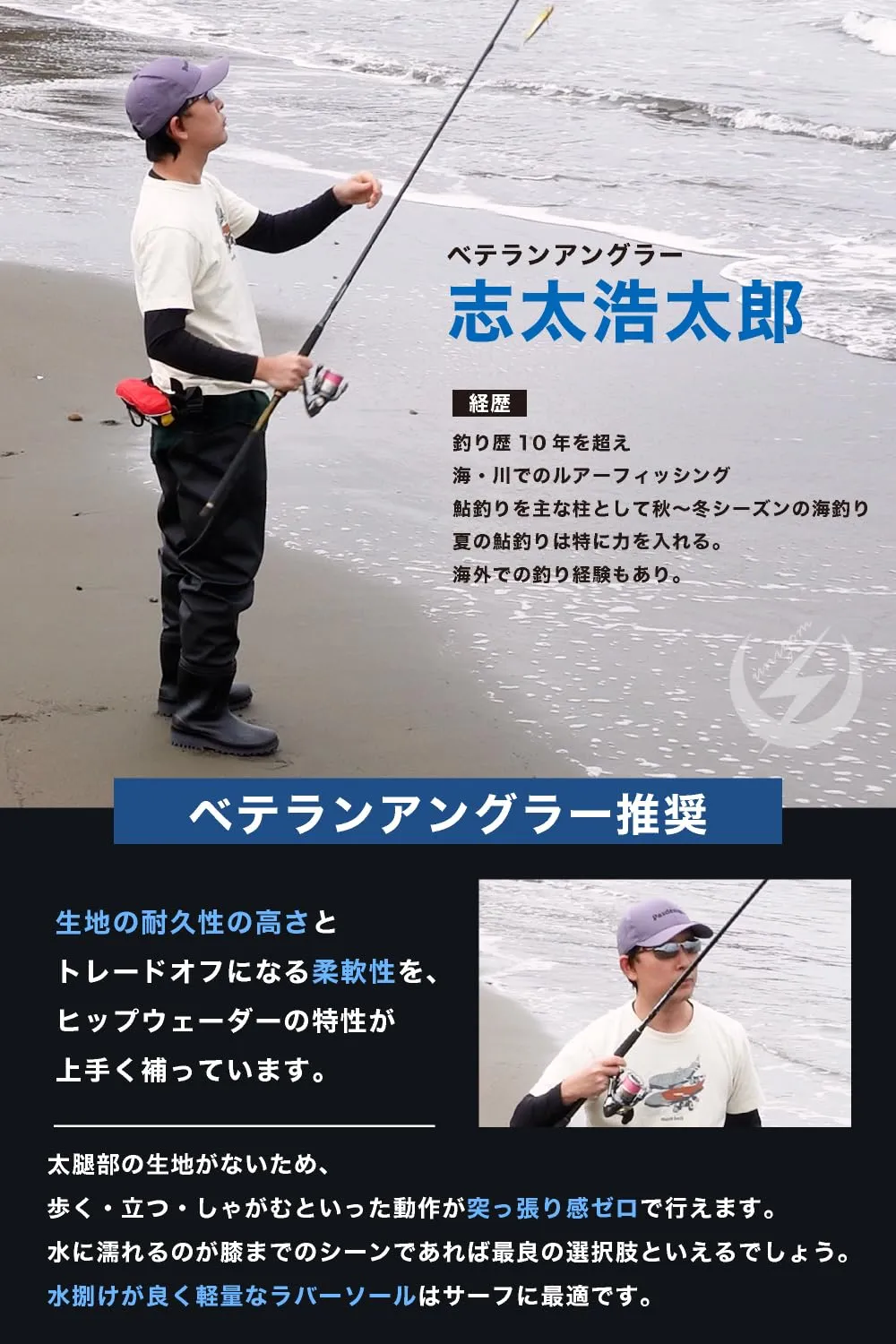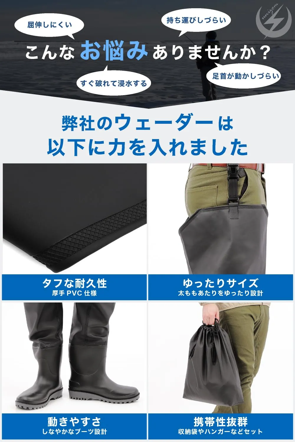 【幅広い利用シーン】 釣り(海・川・渓流)、農作業、洗車、防災や水害時の清掃など、長靴以上・チェストハイ未満の多様なシーンで活躍します。 渓流釣りやサーフ、泥地での農作業から水害時の清掃まで、あらゆる水辺の現場を快適な作業場に変える太もも丈のヒップウェーダーです。ウェーダー最大の弱点である「浸水」を徹底的に防ぐため、高い耐摩耗性を誇る厚手PVC生地を採用し、ブーツとの繋ぎ目は高熱圧着加工で強固に密封しました。また、太もも周りは厚着の上からでも履きやすい「ゆったり設計」、足元はしなやかに動く「短めのブーツ」を採用することで、歩く・しゃがむといった動作も突っ張り感ゼロのスムーズな機動力を実現しています。靴底には水捌けが良く軽量な万能ラジアルソールを搭載し、本体を固定するサイドベルトの長さも日本人の体型に合わせて最適化することで、長時間の作業でもズレ落ちるストレスがありません。さらに、持ち運びに便利で車内を泥から守る「専用防水収納袋」、逆さ吊りで完全乾燥させカビや生地の劣化を防ぐ「専用ウェーダーハンガー」、靴下の厚みに合わせてフィット感を微調整できる「インソール」、万が一のトラブルに備える「応急補修生地」までを標準装備。届いたその日から過酷な現場へ直行できる、圧倒的なコストパフォーマンスを誇るプロ仕様のフルセットです。