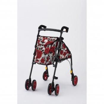 5.2kgの座面付き歩行車タイプ。オシャレに使用でき、両サイドにもポーチが付いており、小物の収納にも便利。キャスターは3WAYで、直進・左右40度・360度で使用可能。使用者体重は75kgまでの方が対象。歩行時は座面を上げ、座る時は座面を出し(必ず駐車ロックをかけていただき)座ることが出来ます。