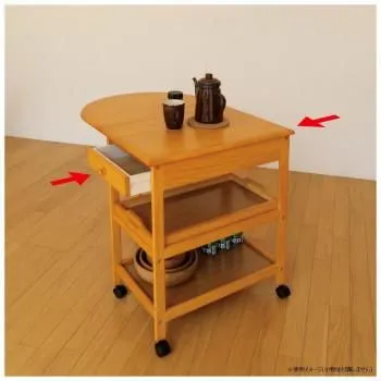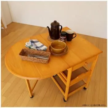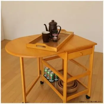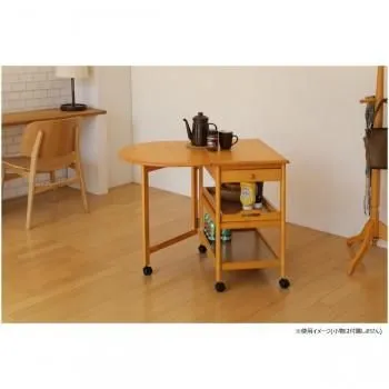 ■ラッピング(包装)対応不可です。 テーブル中段は棚がトレー状で、取り外してハンディトレーとして使うこともできます。 ※サイズの()数字は、折り畳んだ際のサイズです。 サイズW850(425)×D600×H700mm 個装サイズ:13×93×72cm 重量個装重量:15000g 素材・材質フレーム:天然木・塗装 天板:天然木(20mm厚)塗装 仕様組立式 キャスター:ストッパーなし×5個 耐荷重:全体30kg、天板20kg、引き出し5kg、トレー5kg、棚10kg