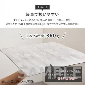 貼ってはがせて、何度も繰り返し使えるフロアタイルです。フィルムをはがして、床の上から貼るだけでお部屋を簡単にイメージチェンジできます。賃貸や新築の床への汚れや傷の防止にもおすすめです。キッチンや洗面所など水周りにも使えて、粘着が落ちても水で洗えば繰り返しご使用いただけます。カッターで簡単にカットでき、お部屋の形に合わせて敷き詰められます。