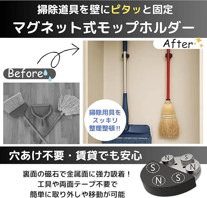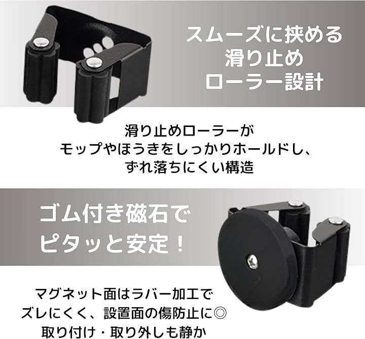 ネオジム磁石の強力吸着で掃除道具を壁にピタッと固定 省スペース収納を叶えるモップホルダー
