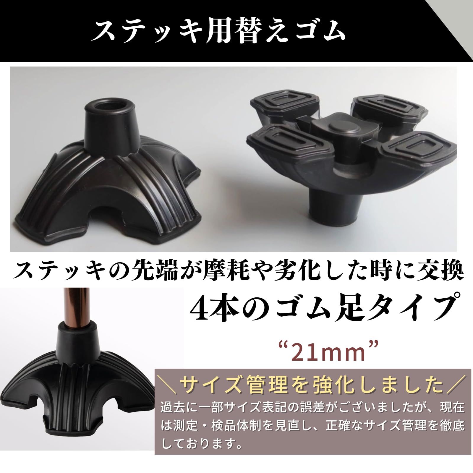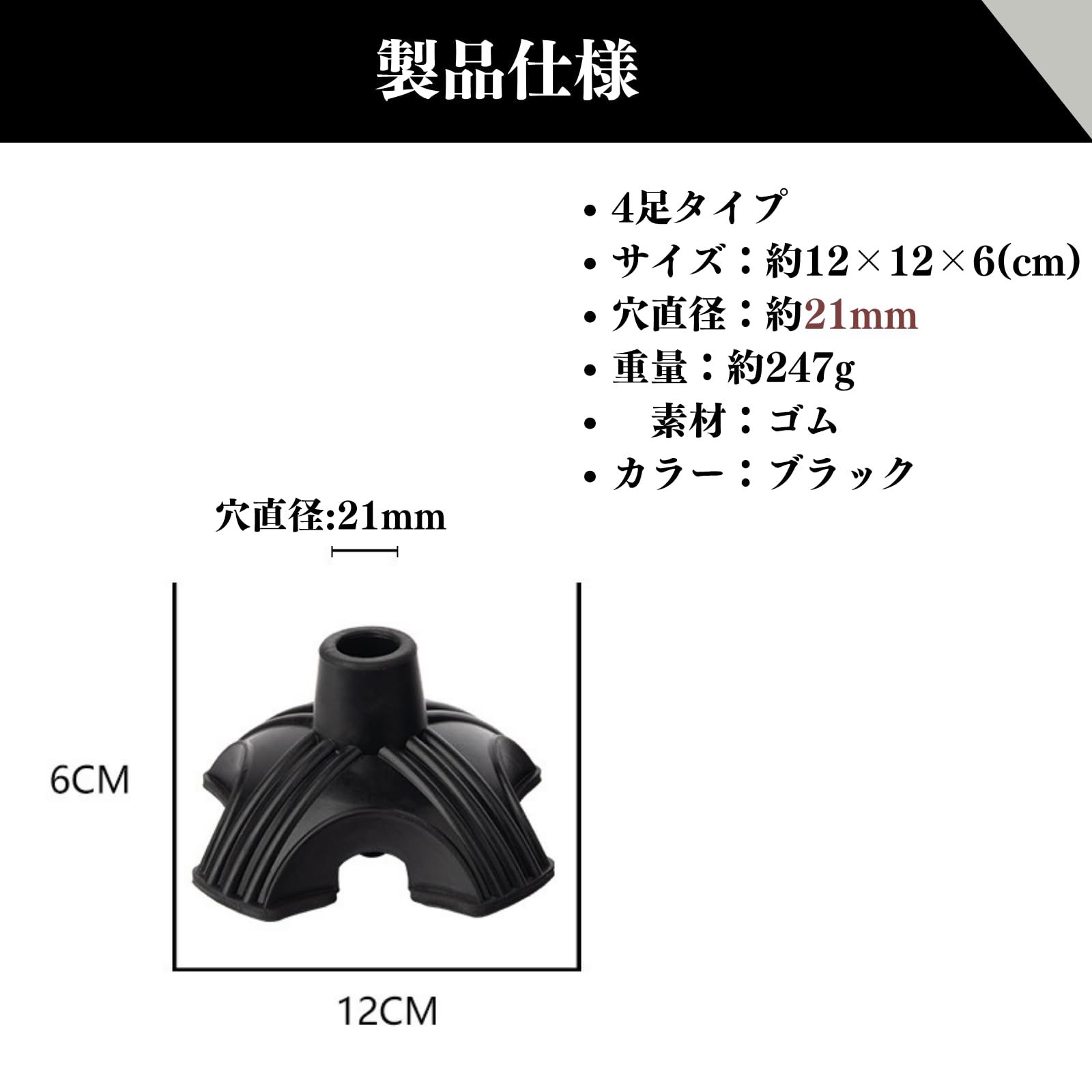 【高品質素材・自立デザイン】耐久性のあるゴム素材を使用し、長期間ご利用いただけます。地面との4つの接触点により、自立するように設計されており、置き場所や杖の収納にも便利です。<br><br>