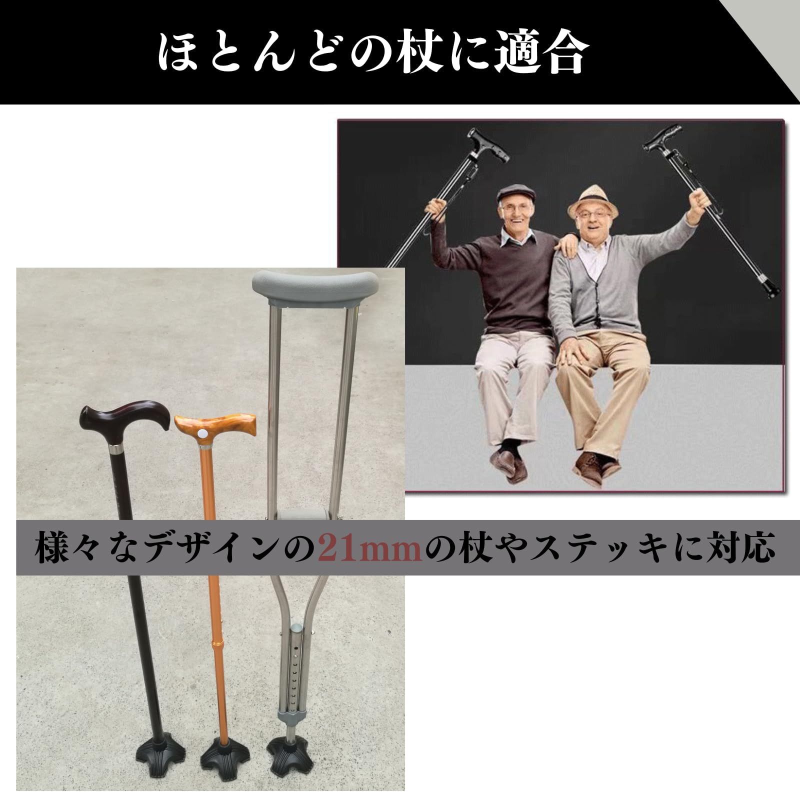 【ほとんどの杖に適合】様々なデザインの21mmの杖やステッキに対応可能です!しっかりとフィットし、ズレにくいです。ご高齢の方へのプレゼントにもおすすめ!<br><br>