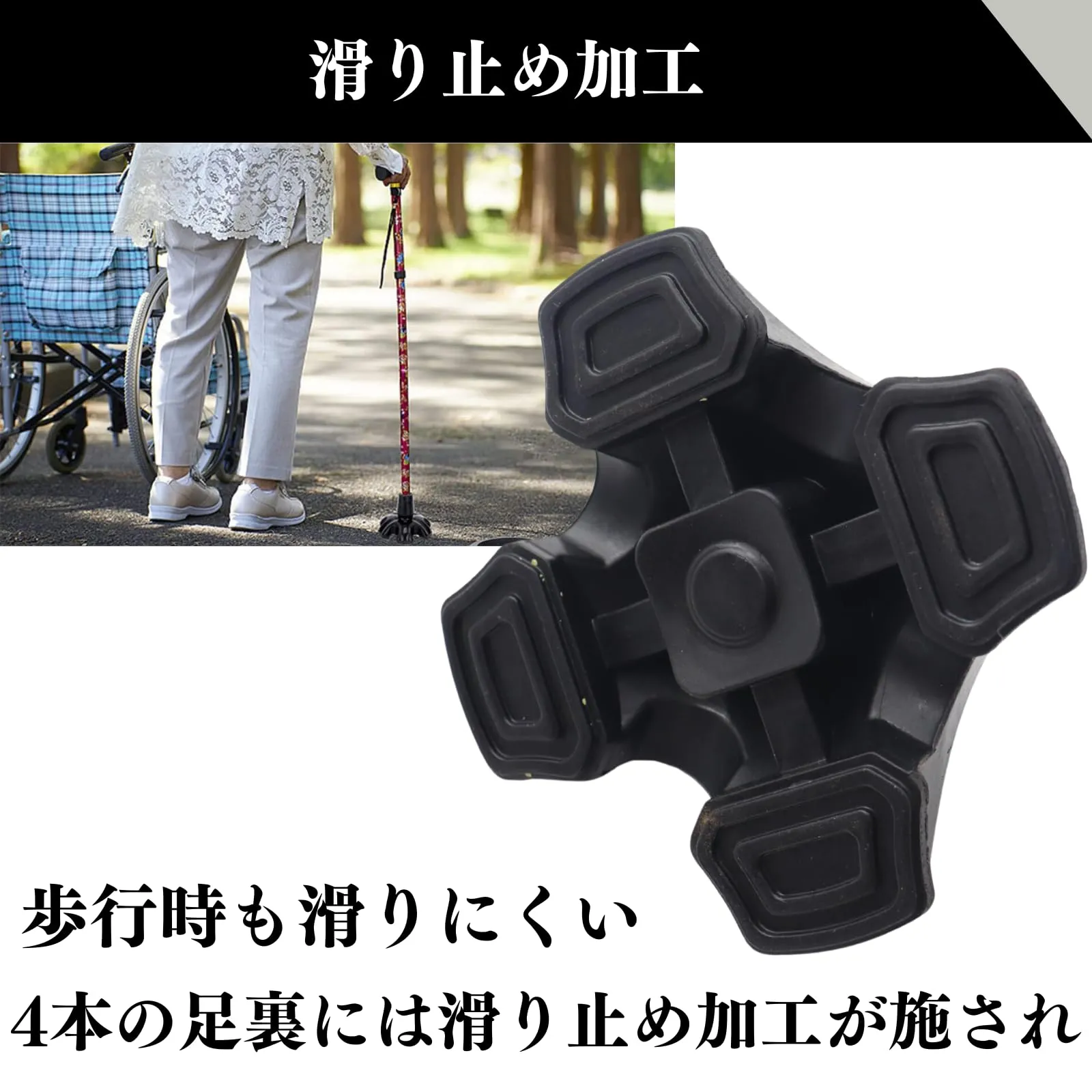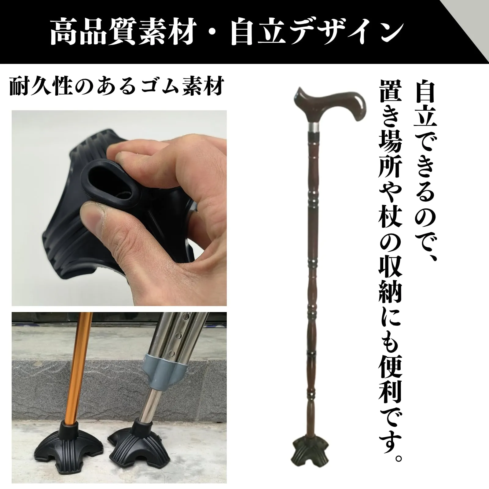 【高品質素材・自立デザイン】耐久性のあるゴム素材を使用し、長期間ご利用いただけます。地面との4つの接触点により、自立するように設計されており、置き場所や杖の収納にも便利です。