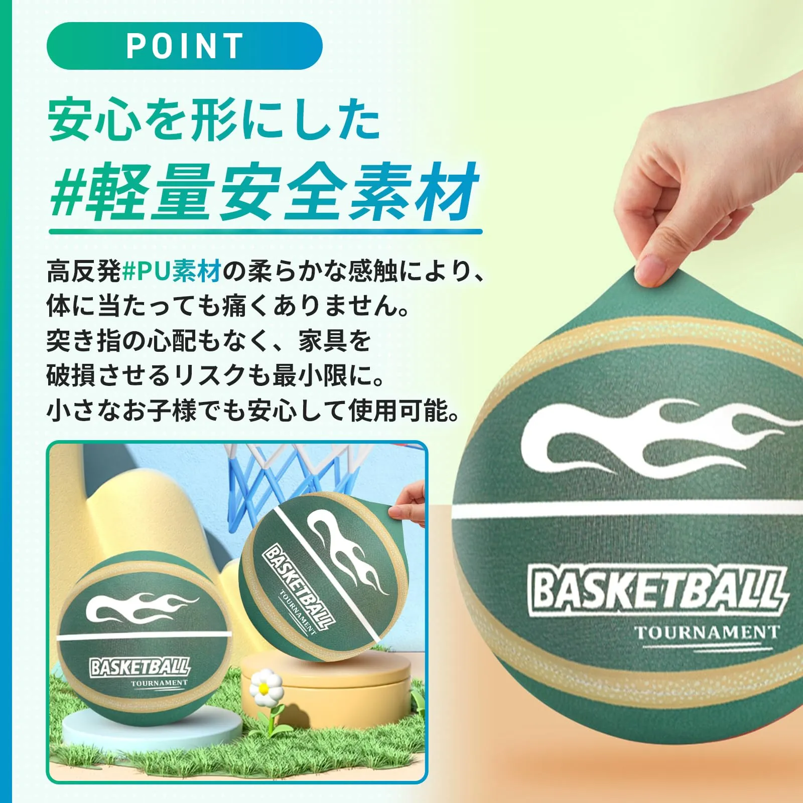 安全素材:高反発PU素材の柔らかな感触。突き指の心配なし。家具やテレビにぶつかっても破損せず、小さなお子様も安心。 ✅