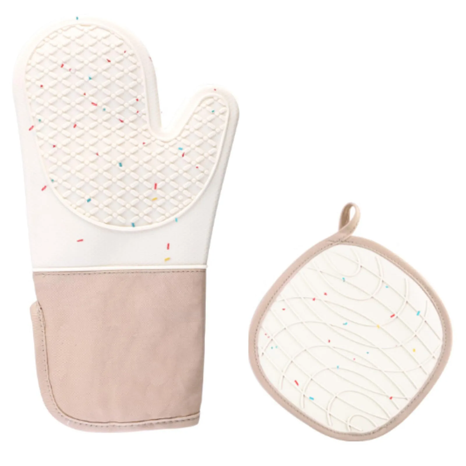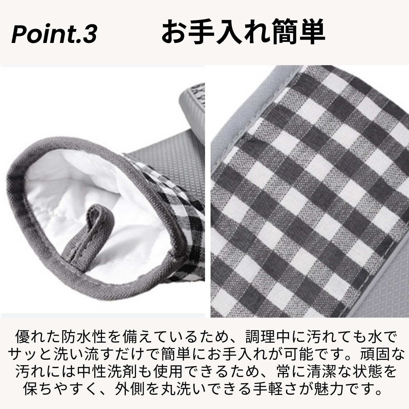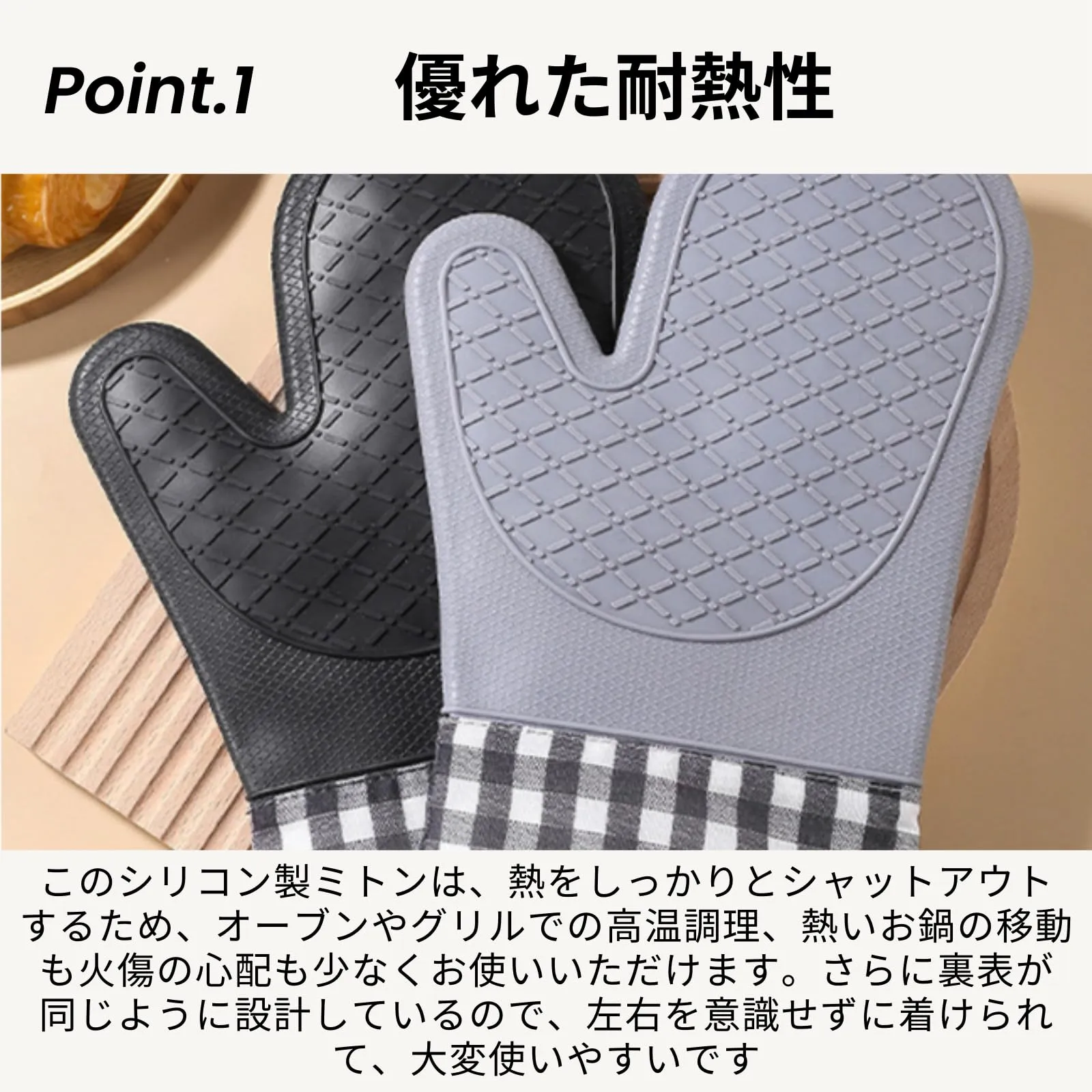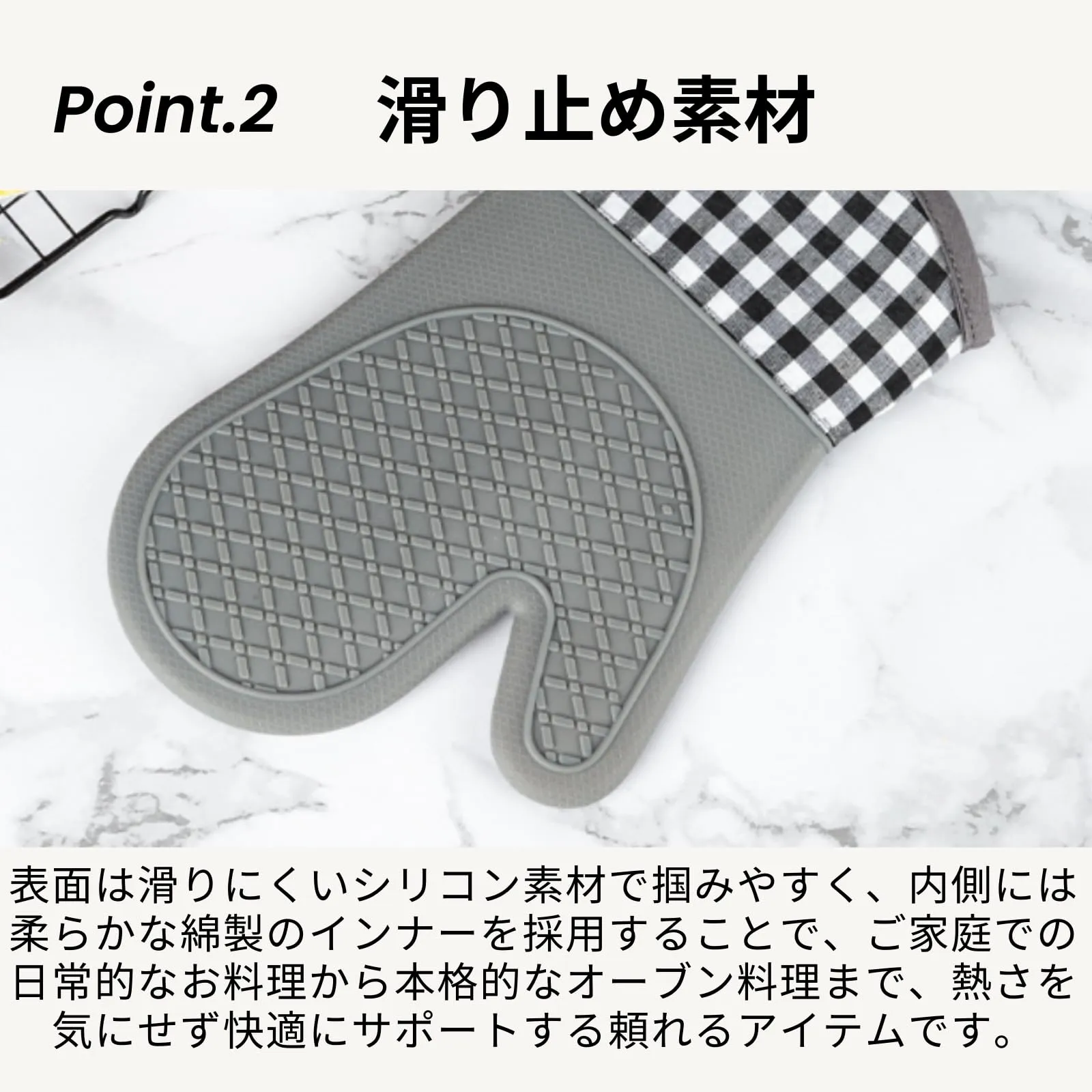 【滑り止め素材】表面は滑りにくいシリコン素材で掴みやすく、内側には柔らかな綿製のインナーを採用することで、プロの現場でも通用する機能性と心地よい手触りを両立させました。ご家庭での日常的なお料理から本格的なオーブン料理まで、熱さを気にせず快適にサポートする頼れるアイテムです。