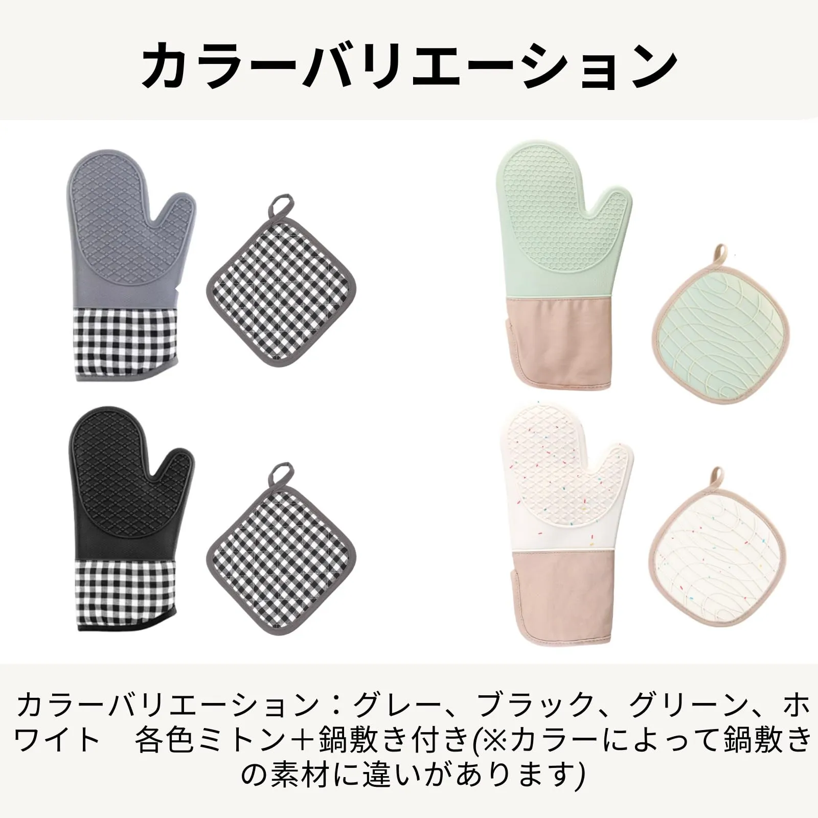 【商品詳細】サイズ:ブラック,グレー 30×19cm /グリーン、ホワイト 33.5×19cm セット内容:ミトン1個+鍋敷き1枚 ※生産ロットの関係で若干のデザイン変更ある場合がございます。