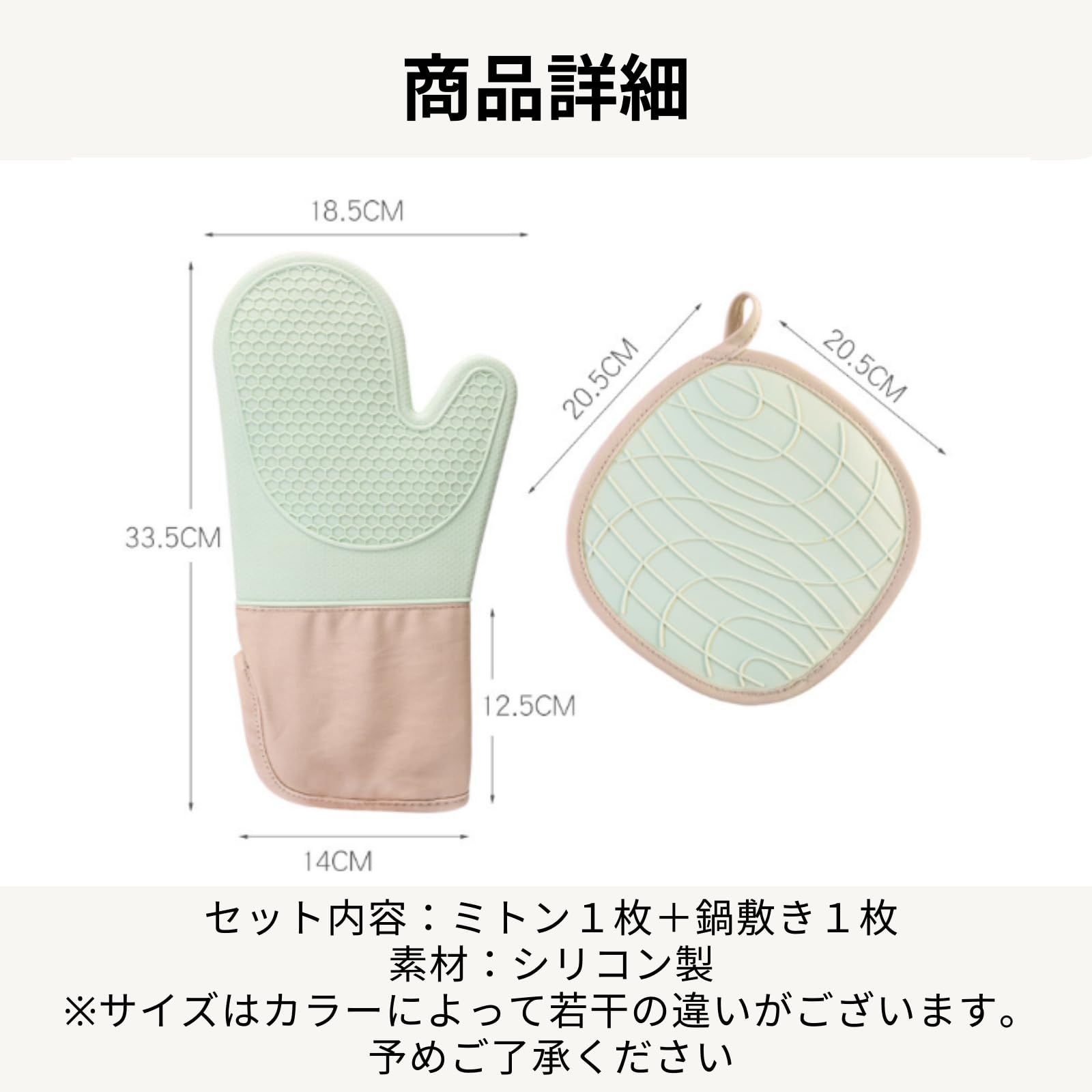 【商品詳細】サイズ:ブラック,グレー 30×19cm /グリーン、ホワイト 33.5×19cm セット内容:ミトン1個+鍋敷き1枚 ※生産ロットの関係で若干のデザイン変更ある場合がございます。 このシリコン製ミトンは、熱をしっかりとシャットアウトするため、オーブンやグリルでの高温調理、熱いお鍋の移動も火傷の心配も少なくお使いいただけます。さらに裏表が同じように設計しているので、左右を意識せずに着けられて、大変使いやすいです。