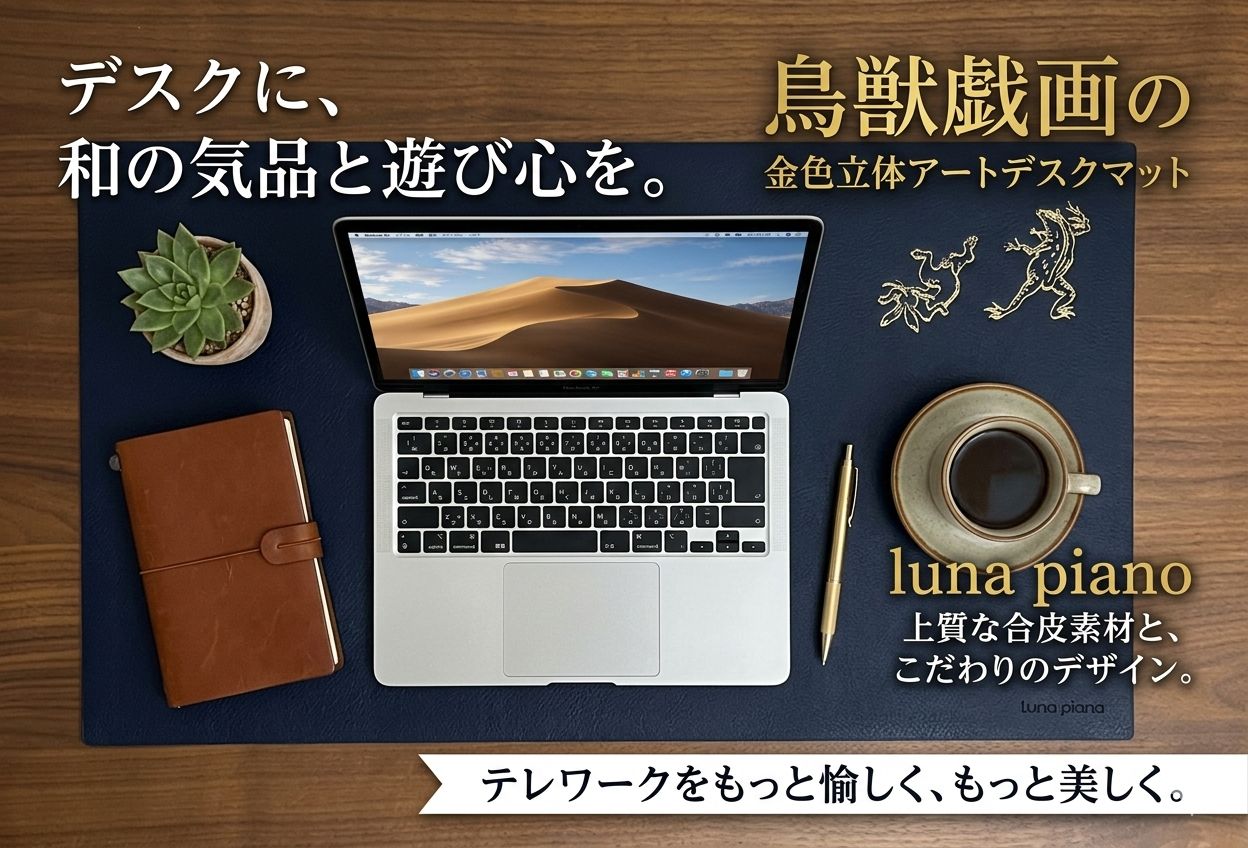 【 特徴 】 ════════════════════════ ✦ 国宝・鳥獣戯画モチーフの金色立体加工 ✦ デスク・テーブルを和モダンに演出 ✦ 完全オリジナル 限定生産品 ✦ 素材:上質ヴィーガンレザー (水に強い・お手入れ簡単) ════════════════════════
