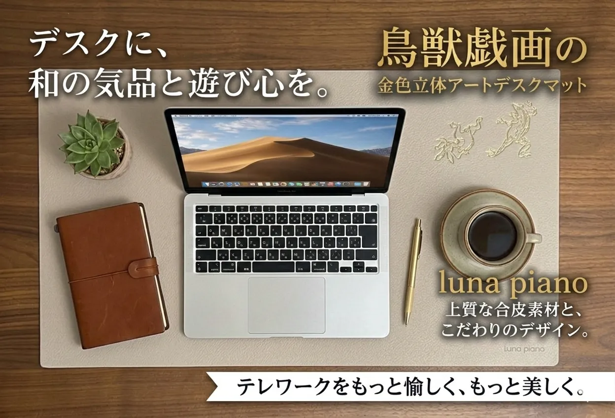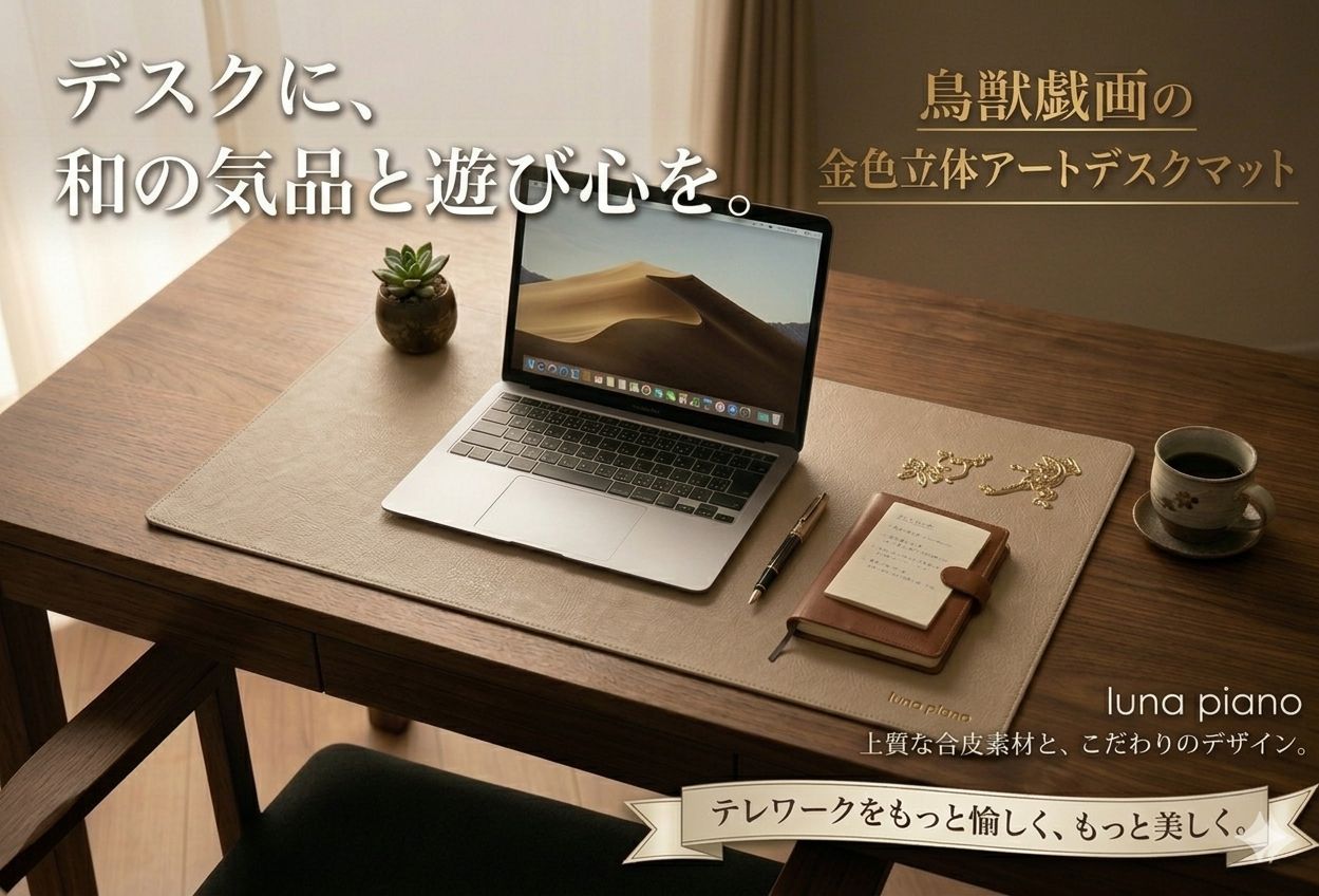 【 特徴 】 ════════════════════════ ✦ 国宝・鳥獣戯画モチーフの金色立体加工 ✦ デスク・テーブルを和モダンに演出 ✦ 完全オリジナル 限定生産品 ✦ 素材:上質ヴィーガンレザー (水に強い・お手入れ簡単・滑り止め効果あり) ════════════════════════
