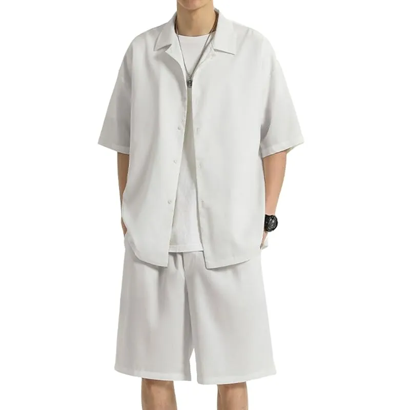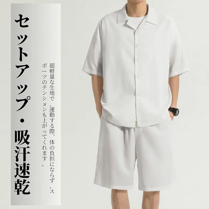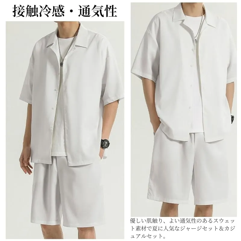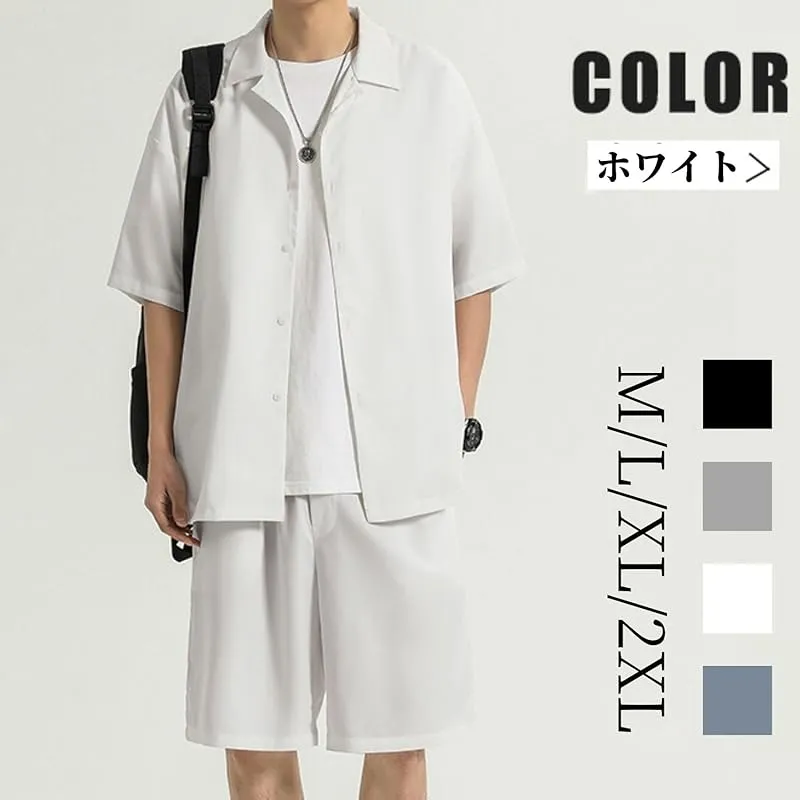 [Aaronlive] シャツ メンズ 上下セット 夏 セットアップ 半袖 ハーフパンツ カジュアル 大きいサイズ トップス ショットパンツ 無地 通気性 薄手 涼しい 吸汗速乾 おしゃれ 2点セット アウター メンズ 夏服 white L 0