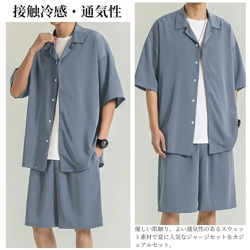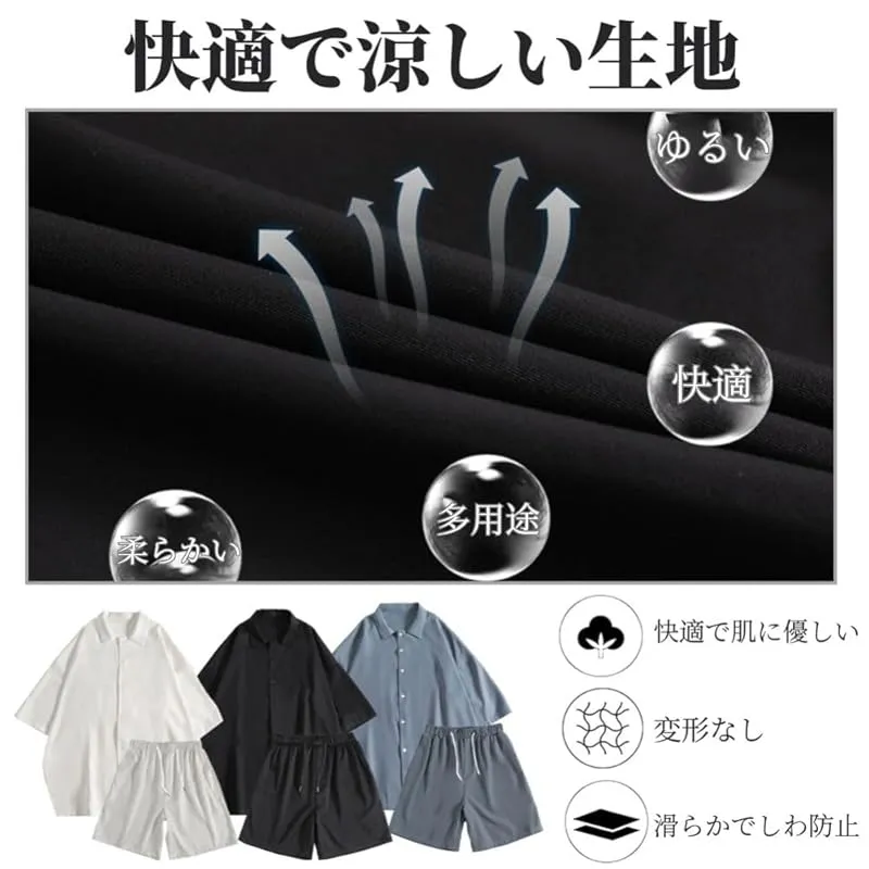 【SIZE:2XL】身長の目安:175-180cm 体重:70-80kg。 サイズの詳細は左画像商品説明をご覧下さい。サイズは平置きでの採寸につき、若干の誤差がある場合がございます。 シルク生地を使用したメンズ2点セットは柔らかくて肌触りが涼しく滑らかで、垂れ感が良くて、おしゃれなスタイルに完成されます。吸汗性・通気性に優れ、夏の暑い時期でも快適な着心地を提供します。洗濯後の乾きも早いです。 半袖:前襟のデザイン、折り畳み襟と高品質のボタンです。ショートパンツ:ウエストはゴムと紐で調整できるイージータイプ、サイドにはポケットがついているので実用性も兼ね備えています。 暑い季節にはうれしい半袖のシャツと半パンツのセットになります。上下セットの冷感シャツとハーフパンツが別々でも使えます。 トップスやボトムスを変えることで幅広い着こなしが可能です。