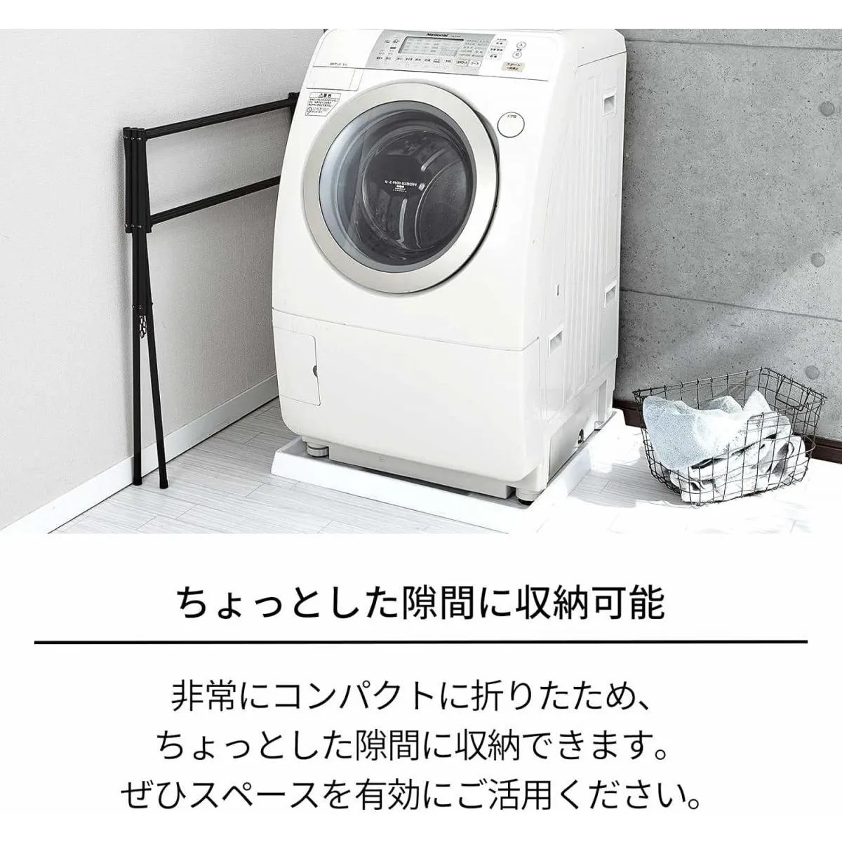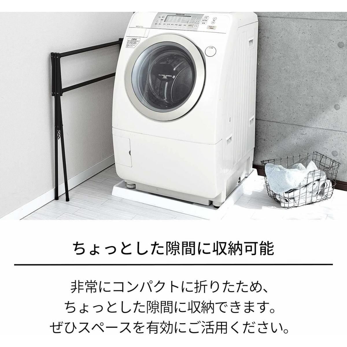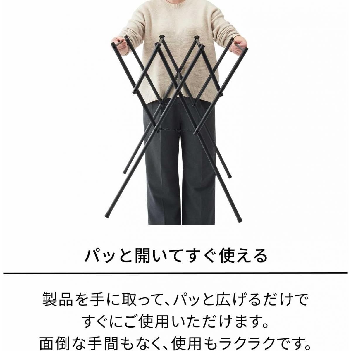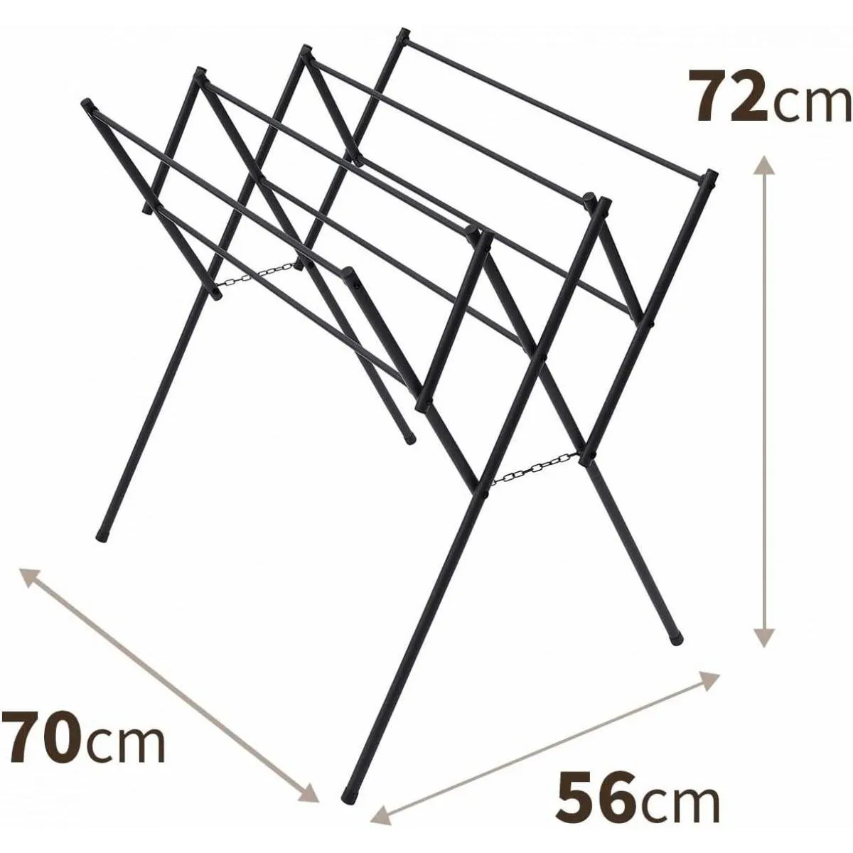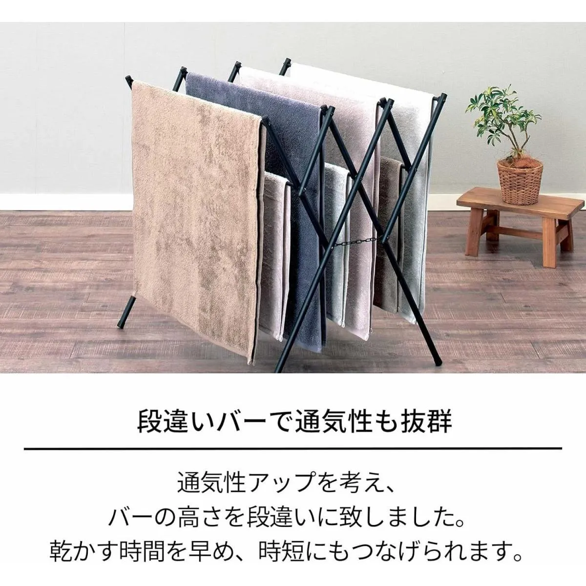 【商品仕様】 カラー:マットブラック 最大外寸(約):幅70×奥行56×高さ72cm 折りたたみサイズ(約):幅70×奥行7×高さ81cm 製品重量(約):1.32kg 全体耐荷重(約):7kg(タオルハンガー1本あたり1kg)