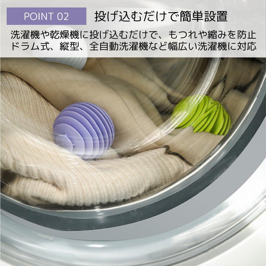 【投げ込むだけで簡単設置!】洗濯機や乾燥機に投げ込むだけで、もつれや縮みを防ぎ、乾燥時間を短縮。糸くずやシワも軽減し、衣類をふんわり滑らかに仕上げます。ドラム式、縦型、全自動洗濯機に対応し、シンプルで可愛いデザインが洗濯時間を楽しく演出します。