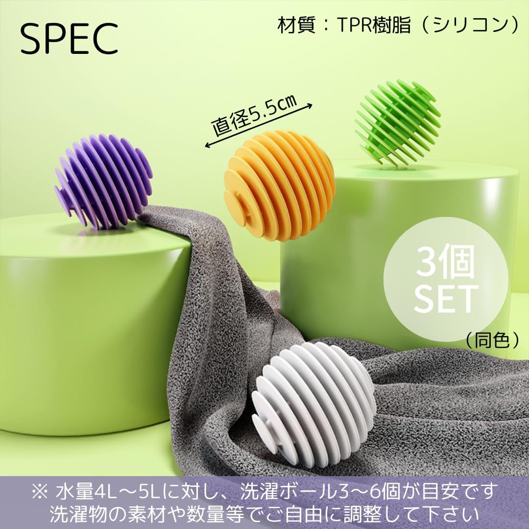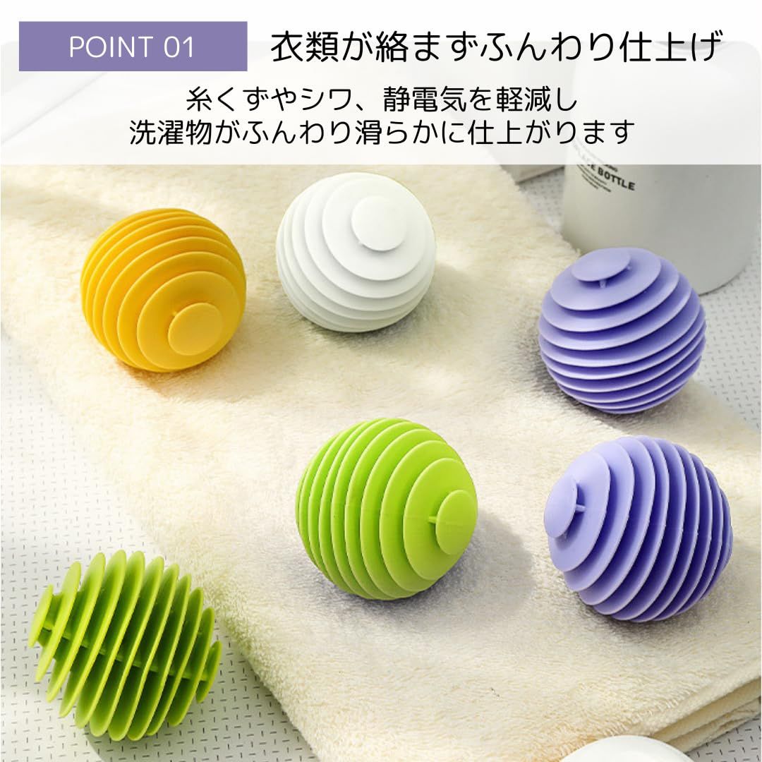 【商品詳細】セット内容:6個 サイズ:直径5.5cm 材質:TPR(熱可塑性ゴム) ※ 水量4L~5Lに対し、洗濯ボール3~6個が目安です。洗濯物の素材や数量等でご自由に調整して下さい。 ※乾燥機でご使用いただけますが、設定温度は75度以下でお願いいたします。75度を超える場合、変形や衣類への影響が生じる可能性がございますので、温度をご確認のうえ、十分ご注意くださいませ。