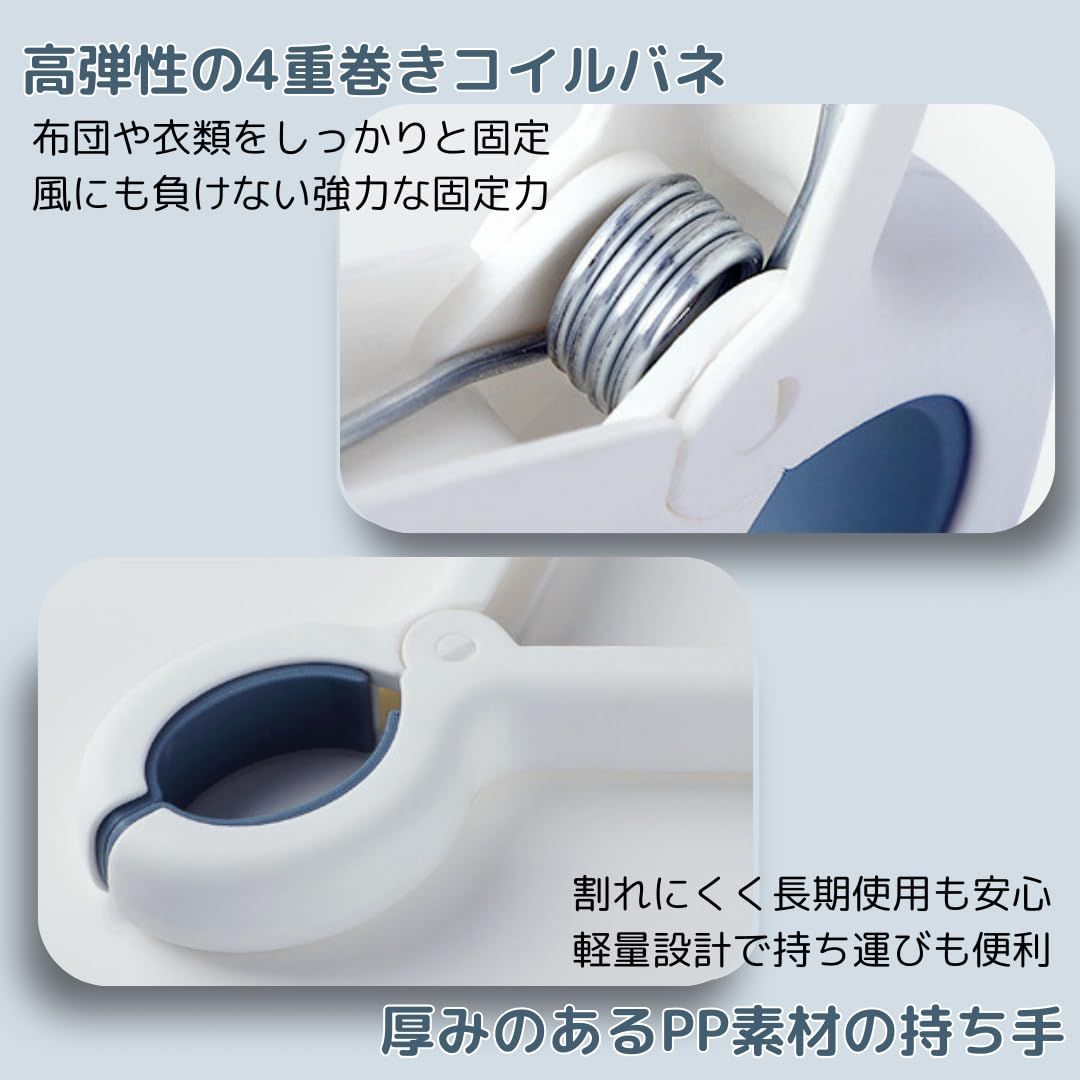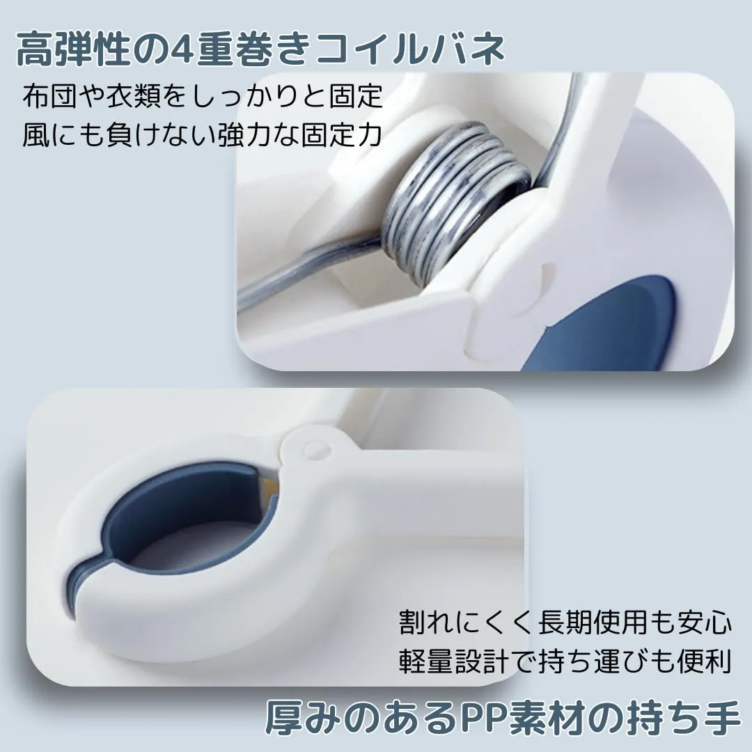 【高弾性スプリングでしっかり固定】高弾性の4重巻きコイルバネを採用し、布団や衣類をしっかりと固定します。これにより、風が強い日でも洗濯物が飛ばされる心配がなく、屋外での使用にも最適です。厚みのある持ち手部分には耐久性に優れたPP素材を採用し、割れにくく、長期間にわたって安心して使用できます。日常の洗濯から屋外での使用まで、強力なホールド力で頼りになるアイテムです。