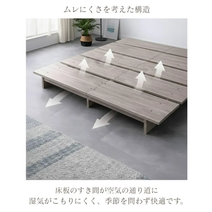 〈ムレにくさを考えた通気構造〉 床板にすき間を設けることで、空気が自然に通り抜ける構造。 湿気がこもりにくく、季節を問わず快適にお使いいただけます。 マットレス下の通気性を確保し、清潔な寝環境をサポートします。