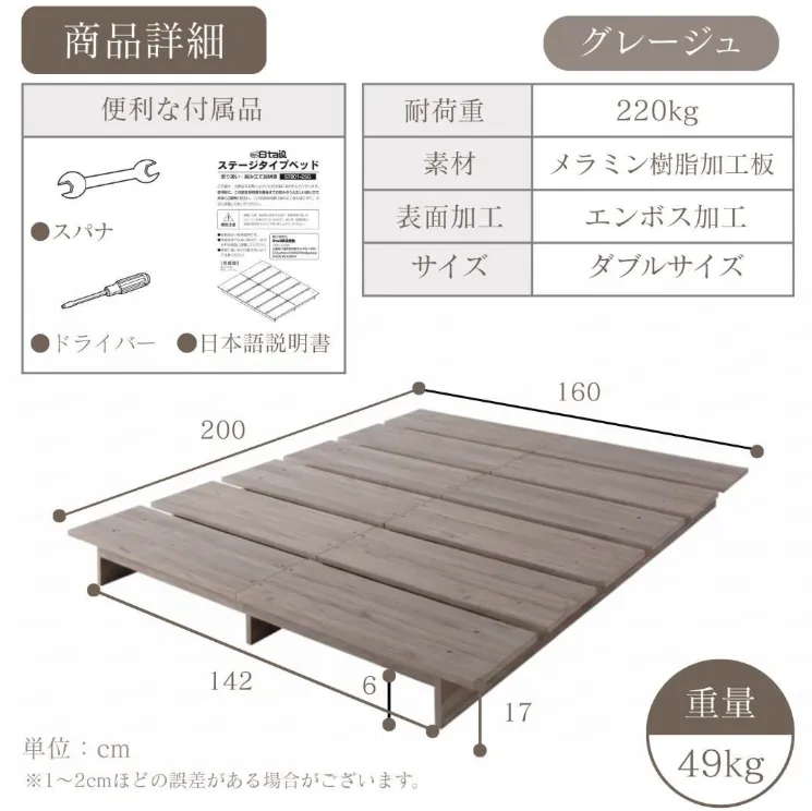 〈商品詳細・仕様〉 カラー:グレージュ 全体耐荷重:約220kg サイズ:ダブルサイズ 素材: ・フレーム:金属(スチール) ・床板:メラミン樹脂加工板(エンボス加工) 重量:約49kg 付属品:スパナ、ドライバー、日本語説明書 ※組立時に工具の準備は不要です。 ※サイズには1~2cm程度の誤差が生じる場合があります。