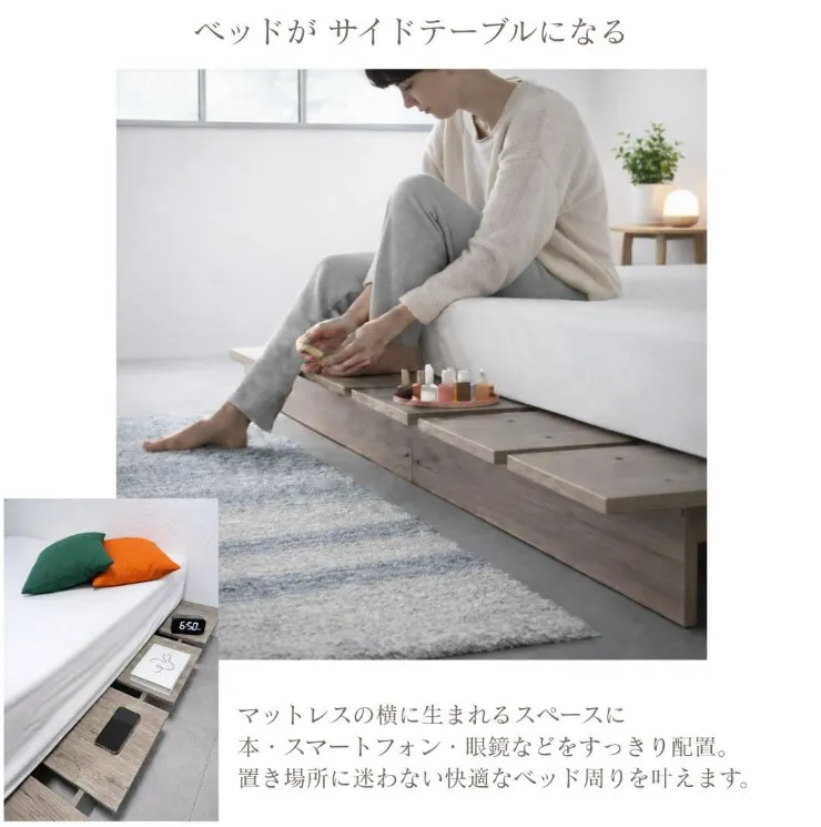 〈ベッドがサイドテーブルになるステージデザイン〉 マットレスの周囲に生まれるステージ部分は、サイドテーブルとして活躍。 本やスマートフォン、眼鏡、時計などを手の届く位置に置くことができ、 置き場所に迷わない快適なベッド周りを実現します。