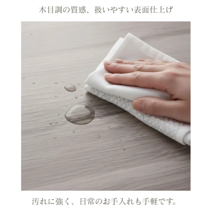 〈木目調の質感と扱いやすい表面仕上げ〉 木目調シートにエンボス加工を施し、自然な風合いと上質感を演出。 表面はメラミン樹脂加工のため、汚れに強くお手入れも簡単。 日常使いに配慮した、扱いやすい仕上がりです。