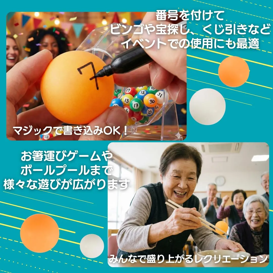 【あらゆる楽しみを】このピンポン玉で、卓球はもちろん、お箸運びゲームやボールプールまで、様々な遊びが広がります。全世代が楽しめるアイテムで、家族や友人との時間がより豊かに。イベントでの使用にも最適で、ビンゴや宝探し、くじ引きなど、楽しいひとときを演出します。