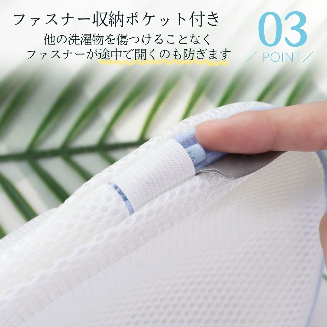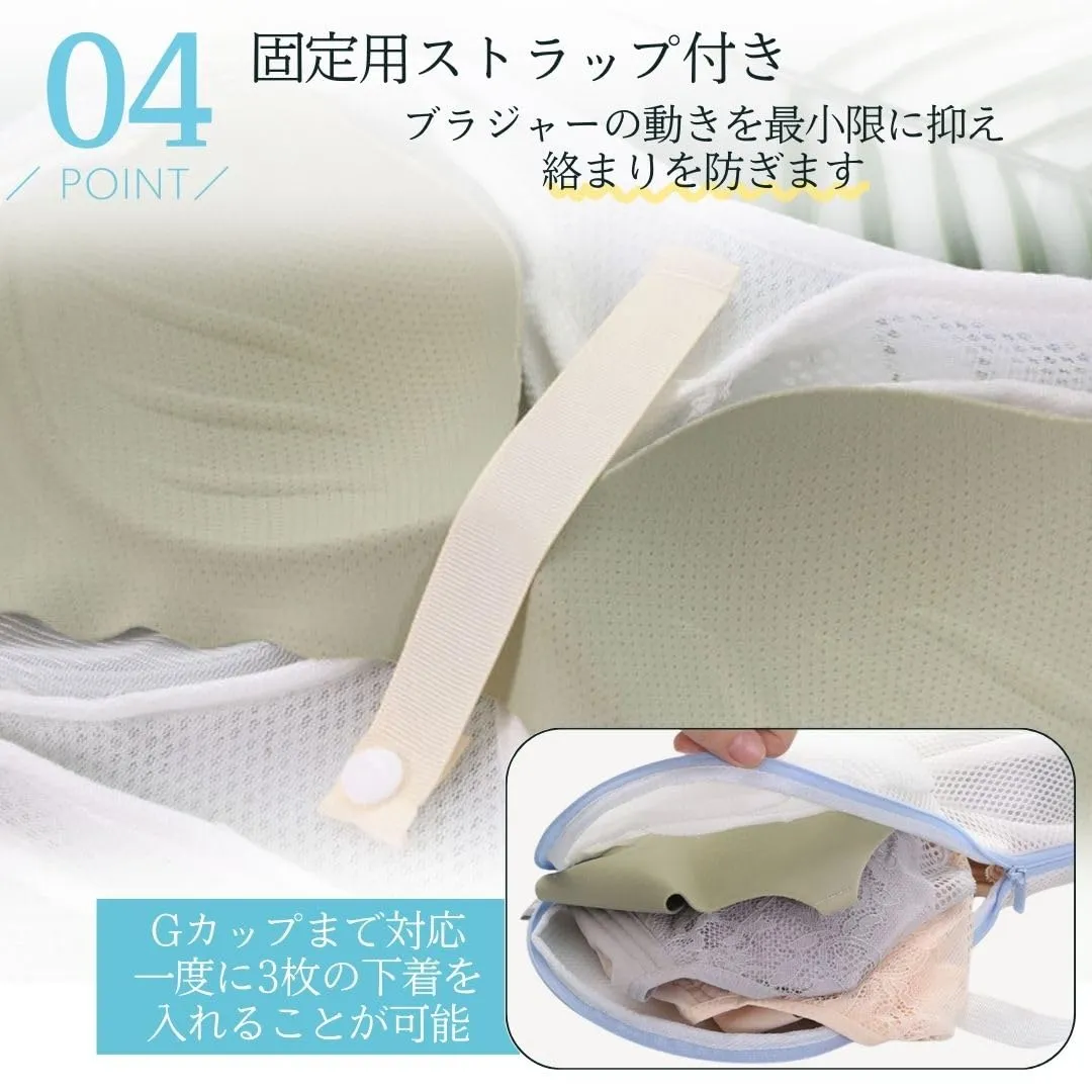 【洗濯中のトラブルフリー】内側に固定用ストラップを装備したこの洗濯ネットは、ブラジャーが内側に回り込んで絡まるのを防ぎ、しっかり保護します。ファスナーは角が丸いプラスチック製で、洗濯物に引っかかりにくい設計。さらにファスナー収納ポケット付きで、他の洗濯物を傷つけることなく、ファスナーが途中で開くのも防ぎます。