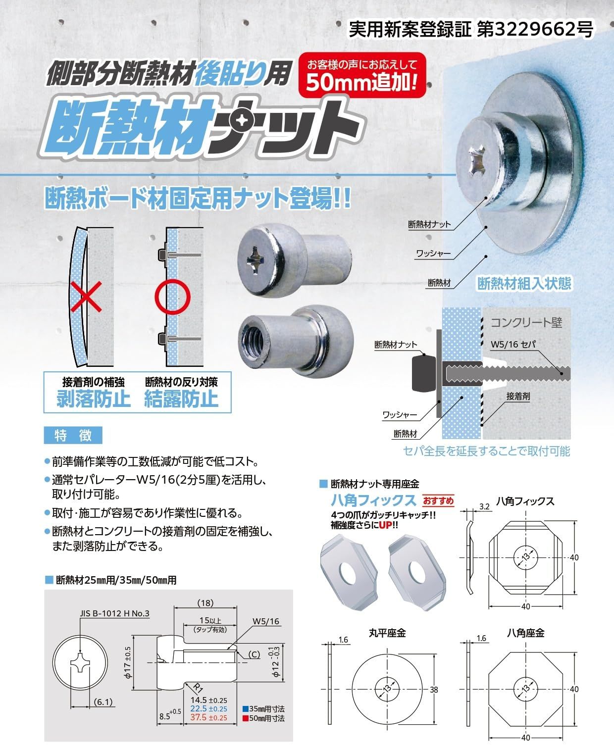 【丸栄機材】断熱材ナット(断熱ボード材固定用ナット)50mm用 50個入りは、断熱ボード材を確実に固定し、反り防止・結露防止・剥落防止に効果を発揮します。W5/16セパレーターに対応し、施工が容易で工数削減・低コストを実現。スチール製で防錆処理を施し、耐久性と信頼性に優れた実用新案登録製品です。ブランド:丸栄機材商品名:断熱材ナット対応断熱材厚み:50mm対応セパレーター:W5/16(2分5厘)用途:断熱ボード材の固定、反り防止、結露防止、剥落防止材質:スチール(防錆処理)入数:50個特徴:施工が容易で工数削減・低コストを実現