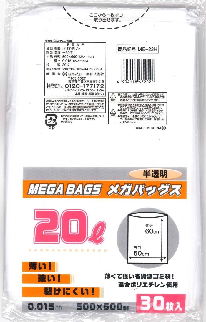 【新品・5営業日で発送】日本技研工業 メガバッグス 半透明 20L 30枚入