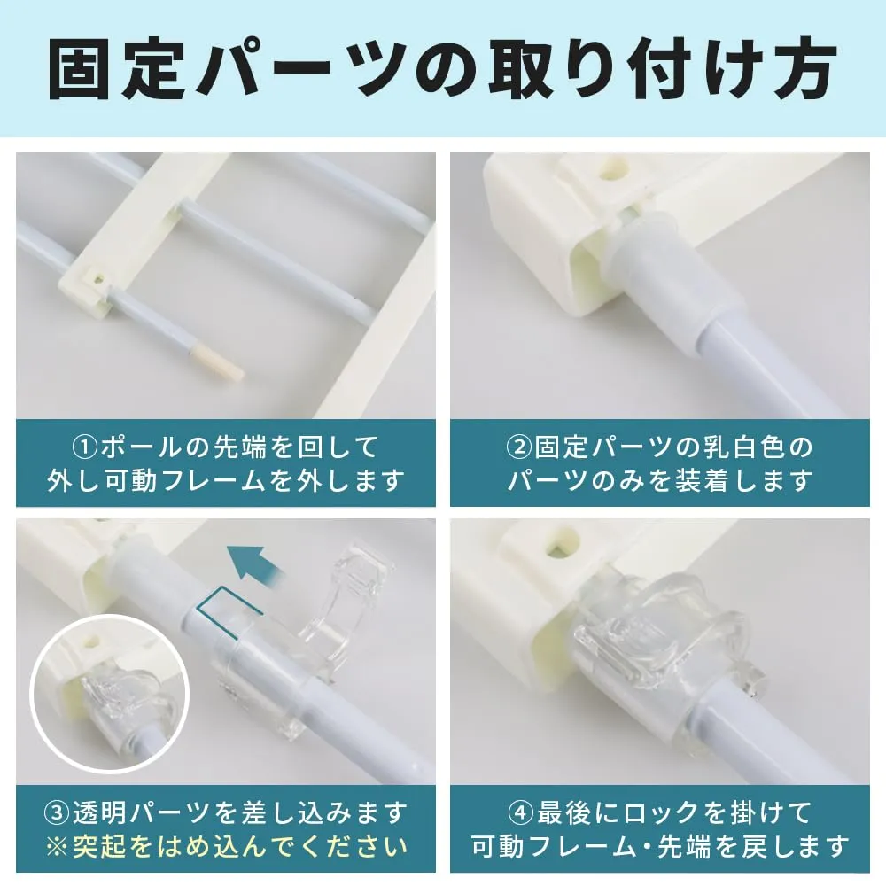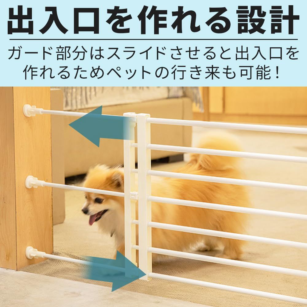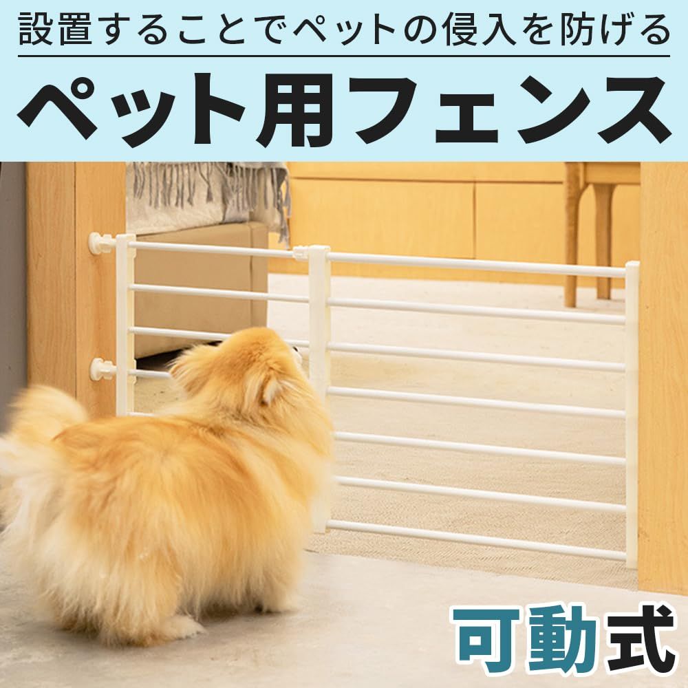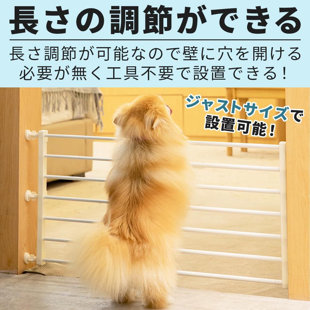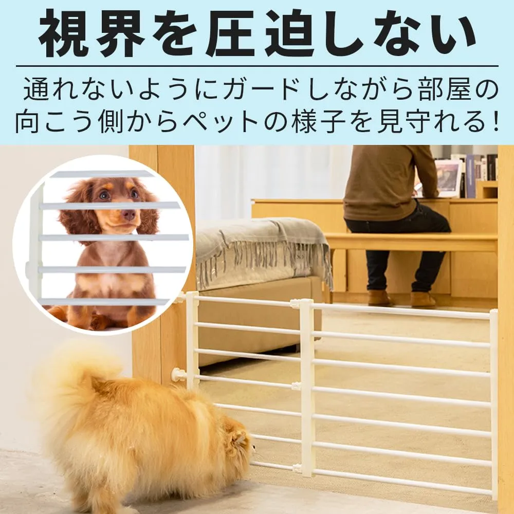 リビング・寝室・キッチンなどの入り口に設置することでペットの侵入を防げるペット用フェンスです。本体は長さ調節が可能なので壁に穴を開ける必要が無く、工具不要でどなたでも簡単に取り付けられます。好奇心旺盛なワンちゃんや猫ちゃんの飼い主さんにお勧めのアイテムです。フレームはワンちゃんや猫ちゃんが通れないようにガードしながらも視界を圧迫しないので、部屋の向こう側からペットの様子を見守れます。 ペットがぶつかっても壊れないよう、耐久性に優れたプラスチック素材を採用しました。ガード部分はスライドさせるだけ幅の調節が可能なので、キッチン・階段・リビングなど様々な場所へ設置できます。