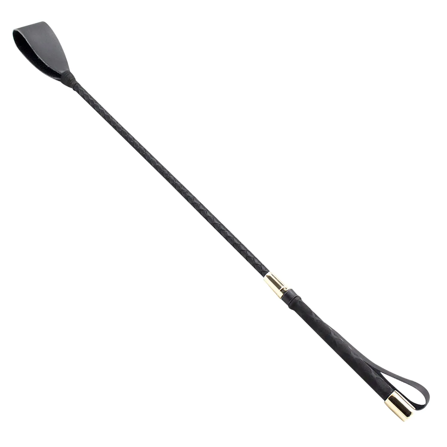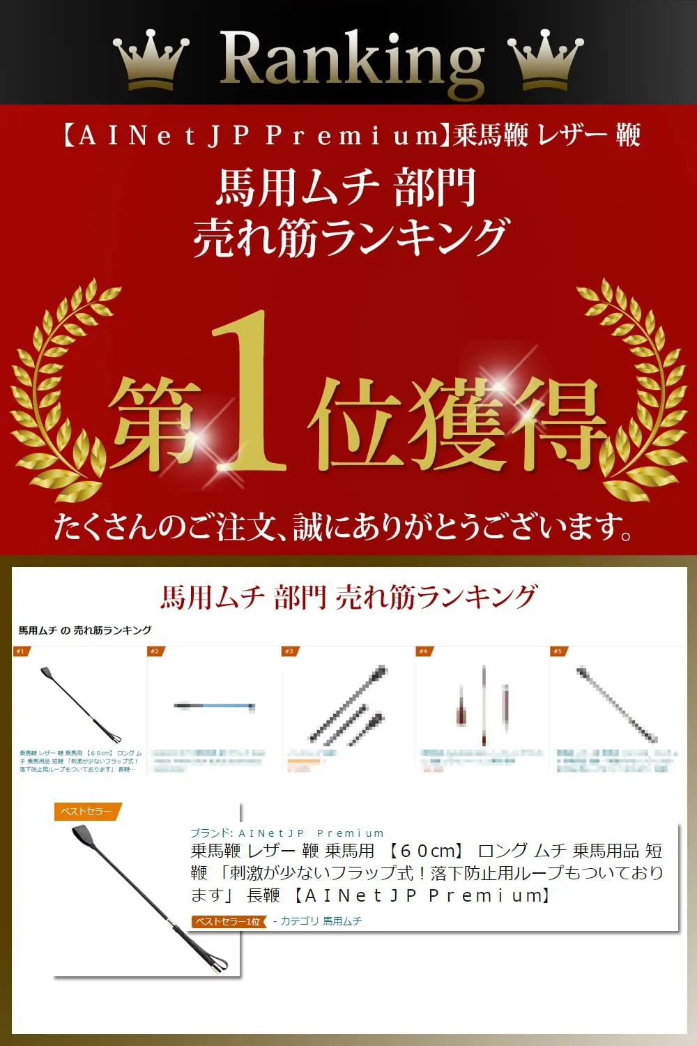 【 AINetJP Premium製 短鞭 】 「AINetJP Premium」製の短鞭は、全長が60cm、重量60gと、初心者の方に扱いやすいサイズになっております。 グリップ部分は滑りにくいレザータイプになっており、万が一滑ったとしても落下を防ぐリストループも付属しております。金具部分はゴールドカラーを採用し、ボディ部分は編み込み仕様で見た目にも高級感が漂う仕様となっております。✅4