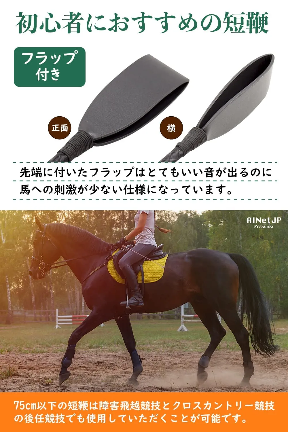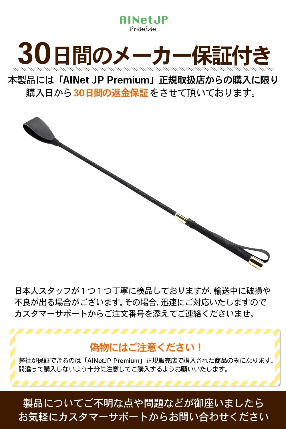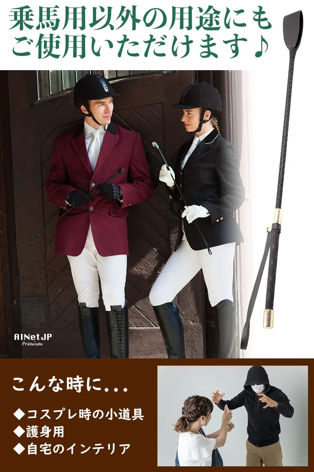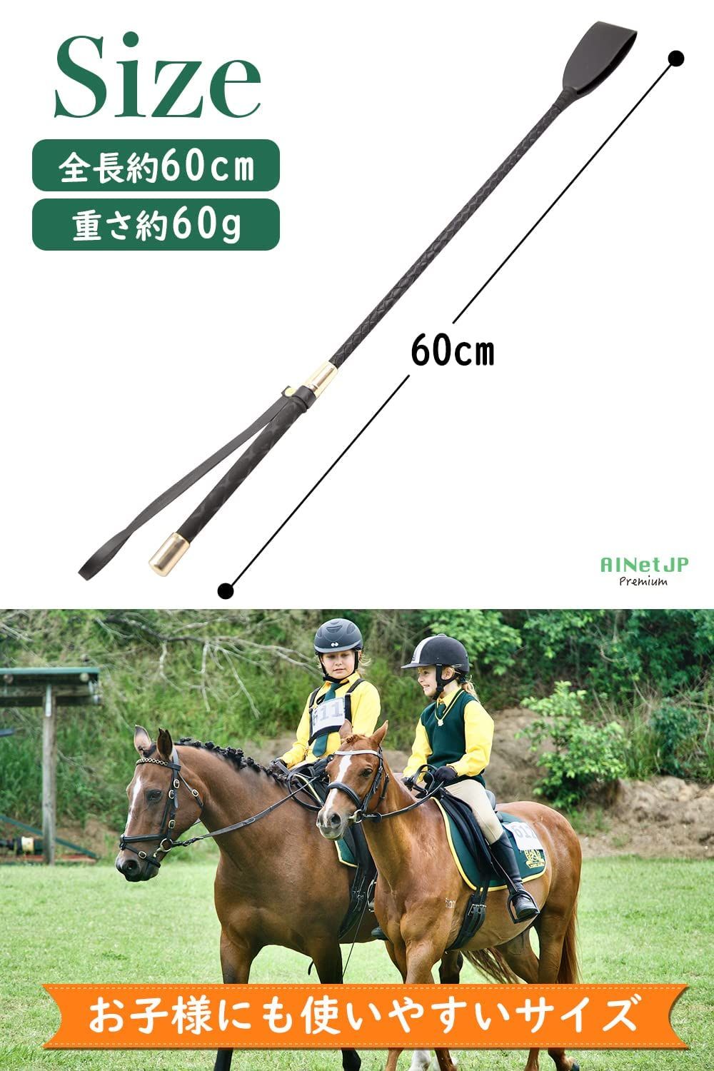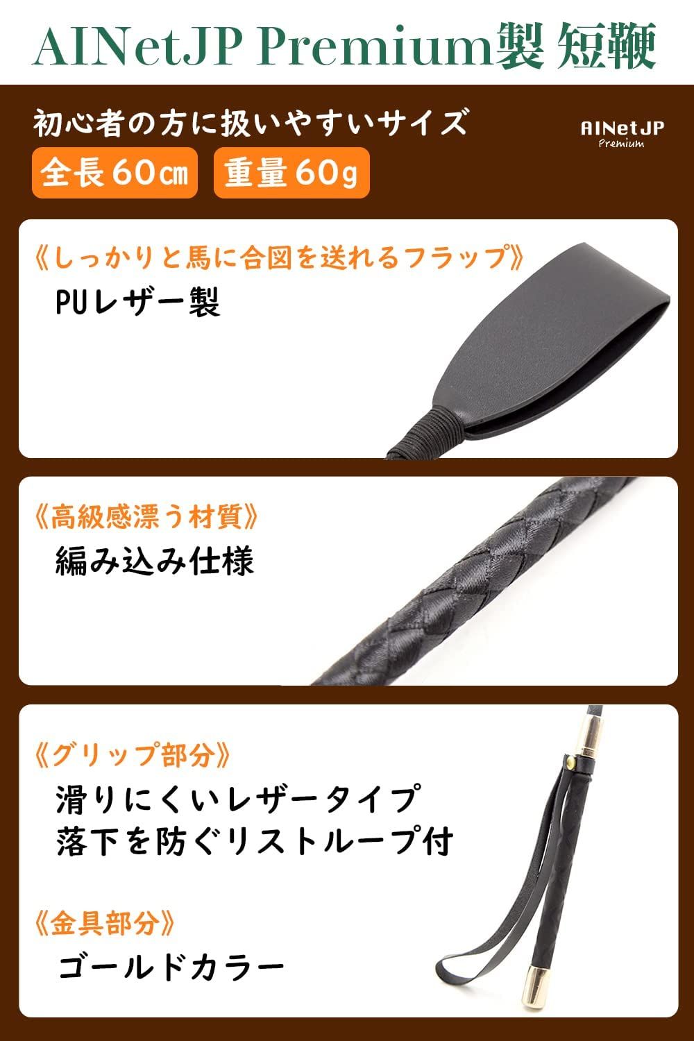 ●「サイズ」全長:60cm 「AINetJP Premium」製の短鞭は、全長が60cm、重量60gと、初心者の方に扱いやすいサイズになっております。 グリップ部分は滑りにくいレザータイプになっており、万が一滑ったとしても落下を防ぐリストループも付属しております。金具部分はゴールドカラーを採用し、ボディ部分は編み込み仕様で見た目にも高級感が漂う仕様となっております。また、先端のフラップ部分はPUレザー製のため、馬に対してしっかりと合図を送れるようになっております。