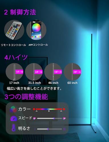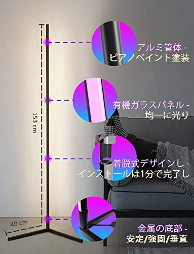 RGB 変色 フロアランプ 調光可能 高さ153cm LED コーナーライト 間接照明 調?度/調速可能 日本語取扱書 フロアスタンド・ランプ 寝室/リビング/遊戯室など適応 アルミニウム 国内発送