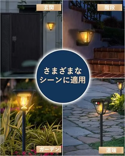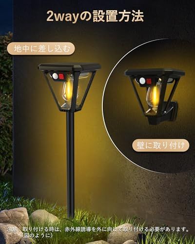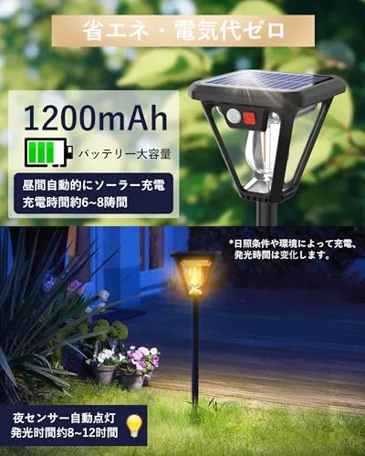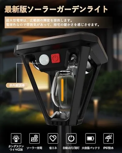 【最新版ソーラー ガーデンライト】最新進化版ソーラー タングステンワイヤCOBランプが新登場!2700 Kの暖かい光は柔らかく雰囲気があります。また、センサー機能向上の為にはセンサー検知角は160にデザインして、従来の検知角120のセンサーライトよりほとんどあらゆる角度は不審者を威嚇できます。