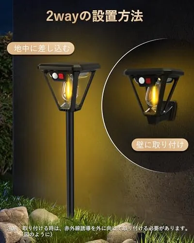 【ガーデンライト・2種類の取り付け方】当店のガーデンライトは2種類の取り付け方があります。通常の地上に差込み以外に壁固定パーツを追加して、壁ライトと地上ライトとして両用できます。必要に応じて、異なる取り付け方を選択できます。階段、玄関前、駐車場、庭、ガレージ、ガーデン、花壇、ベランダ?ポーチ、エントランスなどに適用。夜のお庭や玄関先を華やかかつ省エネルギーにドレスアップできるガーデンライトです。