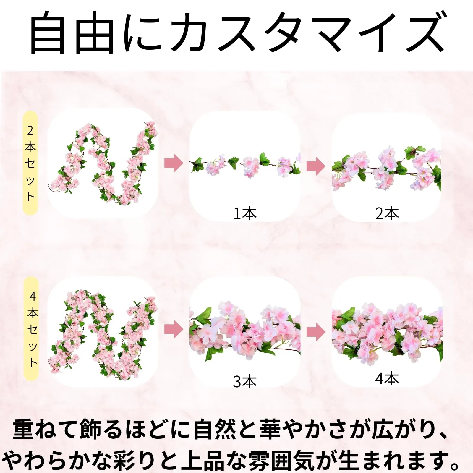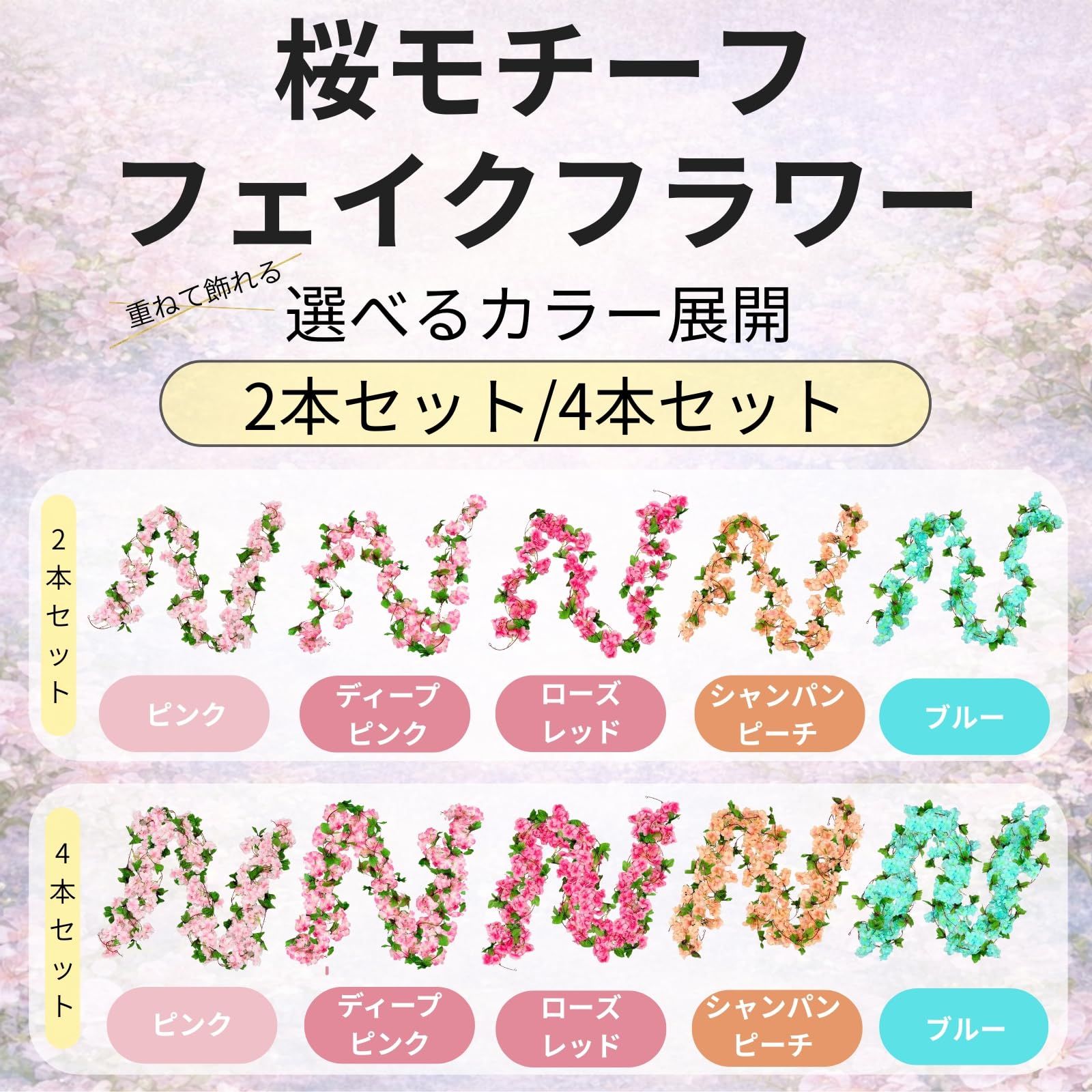 桜モチーフの吊り下げフェイクフラワー、季節を問わず使える装飾アイテム:桜をモチーフにした吊り下げタイプのフェイクフラワーガーランドです。やわらかな花びらの重なりや色合いを意識したデザインで、春の装飾はもちろん、季節感を限定せず一年を通して使いやすい仕上がりとなっています。壁面装飾や窓枠、カーテンレール、アーチ装飾など幅広いシーンに対応し、インテリアとしても店舗ディスプレイとしても取り入れやすい造花アイテムです。2本セット4本セット重ねて使えるボリューム設計:本商品は2本セットと4本セットをご用意。1本ずつ単体で使用することもできますが、複数本を重ねて飾ることで、より自然なボリューム感と立体的な表情が生まれます。2本使用では軽やかで上品な印象に、4本使用では空間全体を包み込むような華やかさを演出可能。設置場所や用途に合わせて本数を調整できるため、自由度の高い装飾をお楽しみいただけます。選べる5カラー展開色のニュアンスを楽しめる配色:ピンク、ディープピンク、ローズレッド、シャンパンピーチ、ブルーの5色展開。単純な色分けではなく、花びらごとの濃淡や色の重なりを意識した配色のため、近くで見ても単調になりにくい仕上がりです。単色使いはもちろん、複数カラーを組み合わせたアレンジも可能。インテリアや店舗の雰囲気、季節演出に合わせてお選びいただけます。店舗自宅イベントまで対応幅広い使用シーン:ご自宅のインテリア装飾としてはもちろん、店舗ディスプレイ、撮影背景、イベント装飾、季節の演出など幅広い用途に対応します。吊り下げ装飾や壁面装飾として使いやすく、レイアウト変更や模様替えにも取り入れやすい仕様です。軽量で扱いやすいため、設置や取り外しも比較的簡単に行え、装飾初心者の方にもおすすめです。フェイクフラワーだからこその扱いやすさ:造花のため水やりや日当たり管理は不要。枯れる心配がなく、長期間安定した状態で使用できます。生花が難しい場所や、頻繁な手入れができない空間にも取り入れやすく、装飾の手間を抑えたい方にも適しています。季節ごとに入れ替える必要がなく、通年装飾として活用できる点もフェイクフラワーならではの魅力です。開封時のご案内:本商品は輸送中の型崩れを防ぐため、コンパクトにまとめた状態でお届けしております。開封後は花や葉をやさしく広げ、全体のバランスを見ながら形を整えてください。花びらや葉のクセが気になる場合は、ドライヤーの温風を少し離した位置から当てることで、より自然でふんわりとした印象に仕上がります。自分好みに整えるアレンジ工程もお楽しみください。開封時のご注意:開封時や形を整える際、花びらや葉の繊維が多少抜け落ちる場合がございます。素材および製造工程上の特性によるもので、不良品ではございません。袋から取り出す際は、下に繊維が落ちても問題のない場所での開封をお願いいたします。使用を重ねることで繊維落ちは次第に落ち着きます。