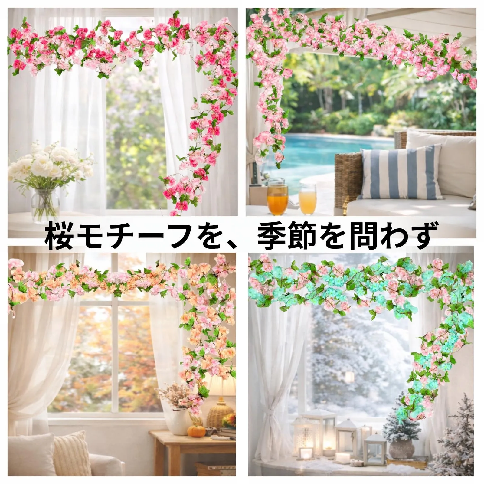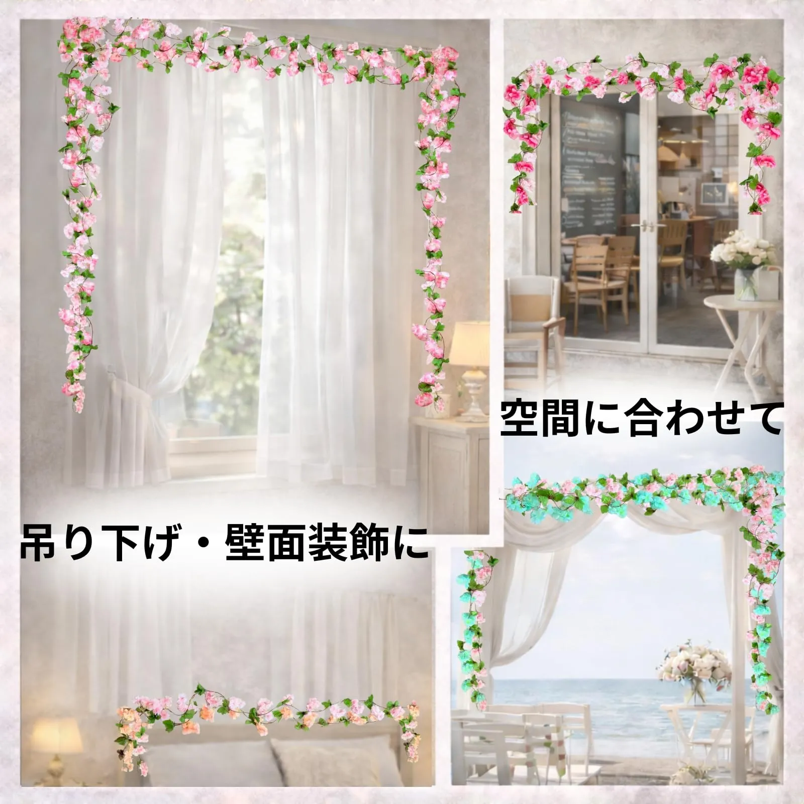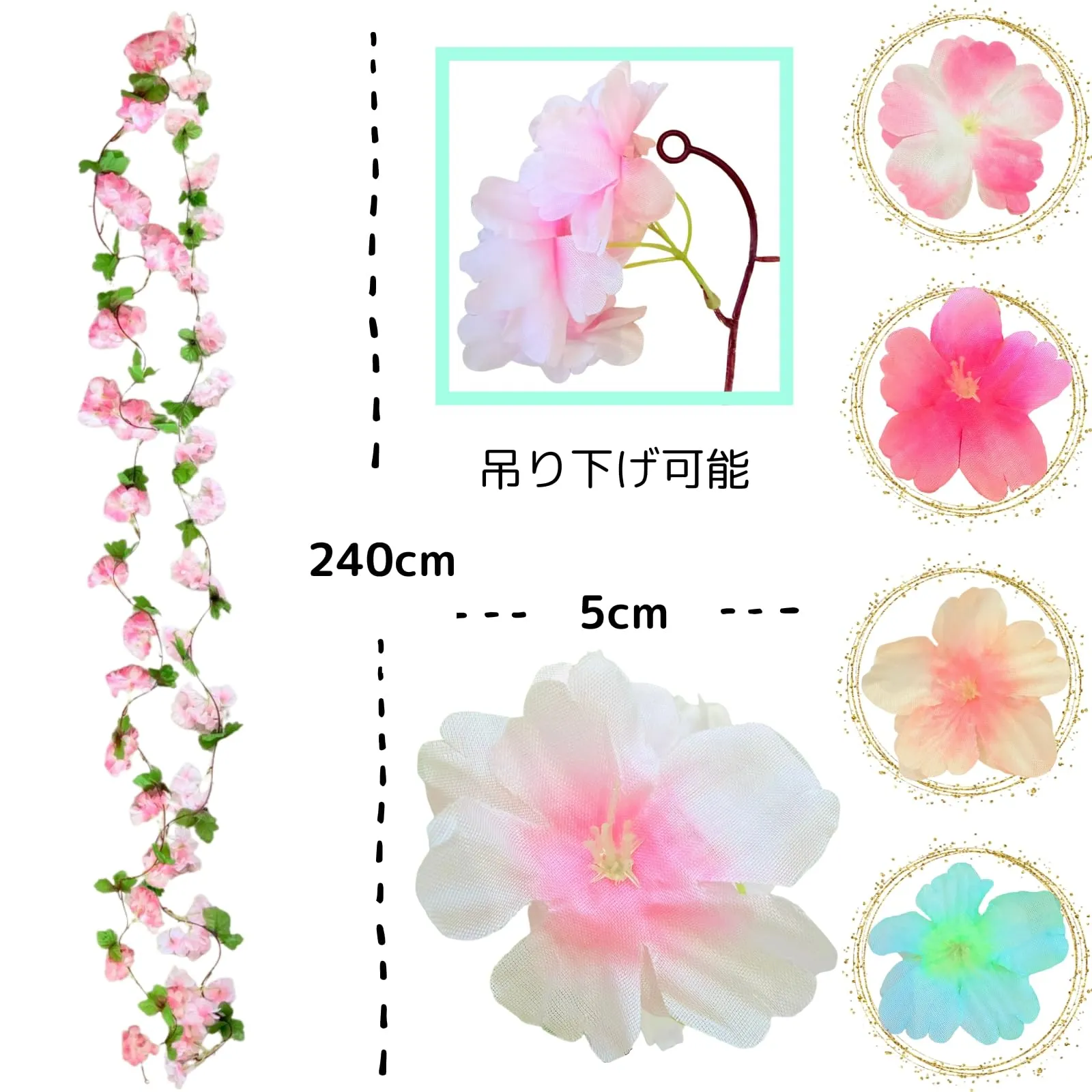 桜モチーフの吊り下げフェイクフラワー、季節を問わず使える装飾アイテム:桜をモチーフにした吊り下げタイプのフェイクフラワーガーランドです。やわらかな花びらの重なりや色合いを意識したデザインで、春の装飾はもちろん、季節感を限定せず一年を通して使いやすい仕上がりとなっています。壁面装飾や窓枠、カーテンレール、アーチ装飾など幅広いシーンに対応し、インテリアとしても店舗ディスプレイとしても取り入れやすい造花アイテムです。