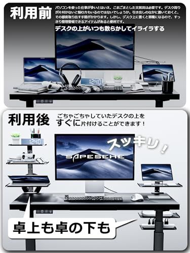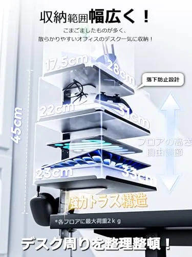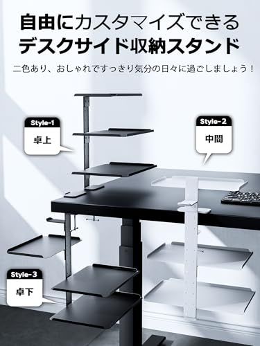3段階 デスク収納トレー: 棚板*3個、高さ自由調節ネジの穴があり、必要に応じてトレイとフックの方向と幅を自由に調整できます。特徴!!棚板のサイズは他の製品より大きい、他の製品よりも大きいサイズ、より厚い素材、そして圧倒的な耐荷重!デスク周りの様々なアイテムをもっと便利に収納できる、強靭で頼れるデスク収納トレイです。卓上収納トレー デスクサイド収納ラック 多用途デスク上置棚