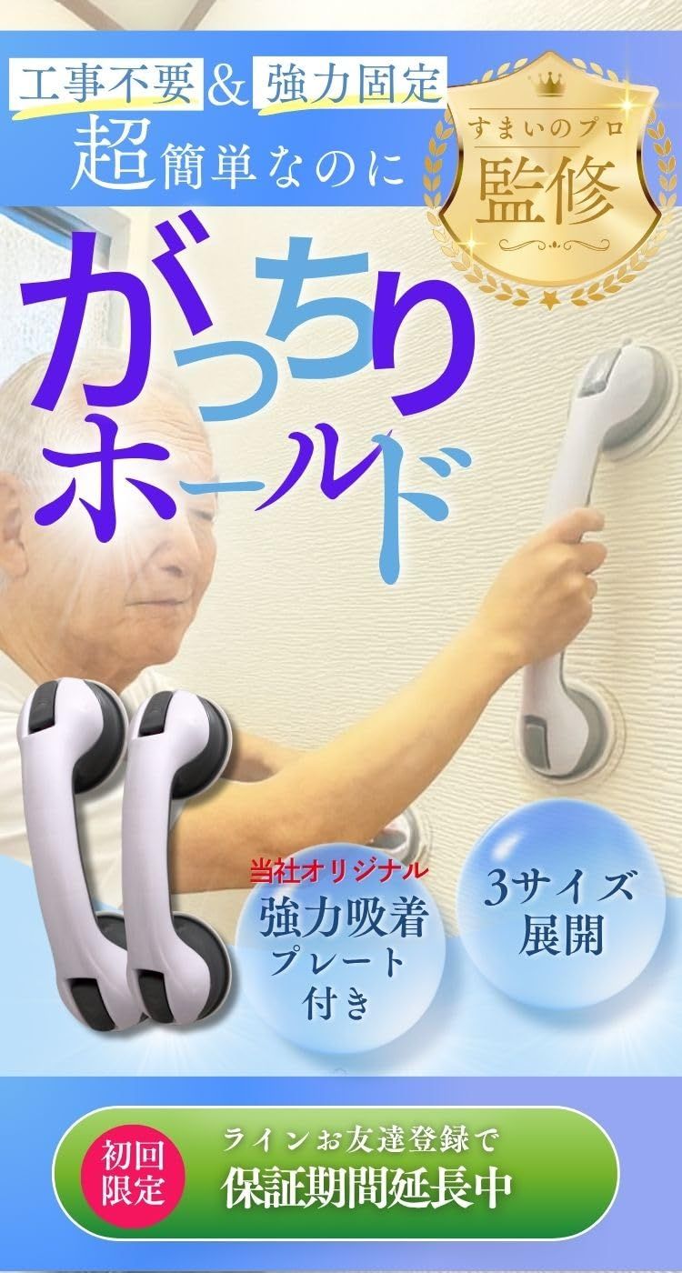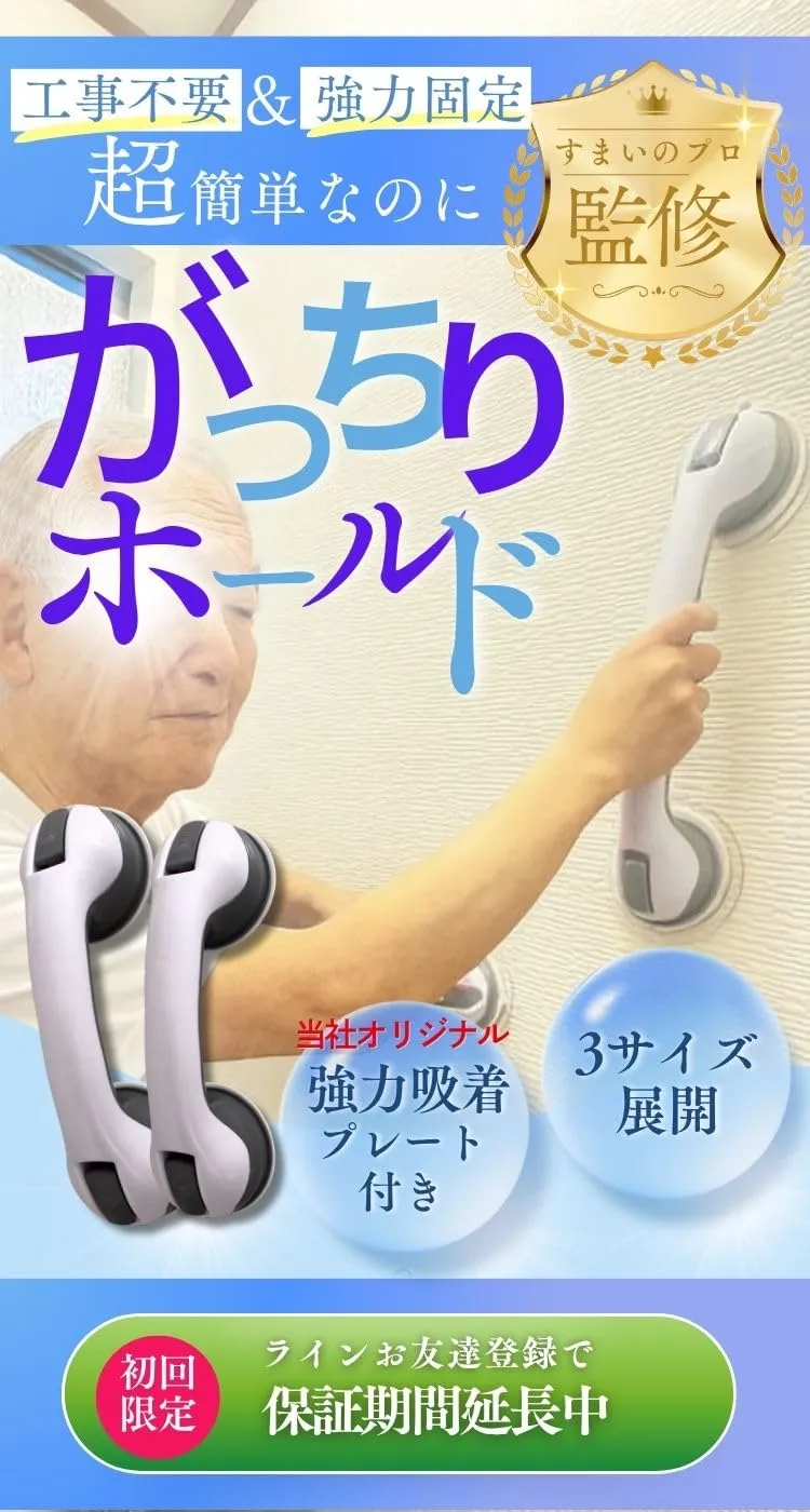 特長:工事・穴あけ不要、吸着式で簡単着脱。手のひらにフィットし、ふらつき・転倒リスクを軽減。