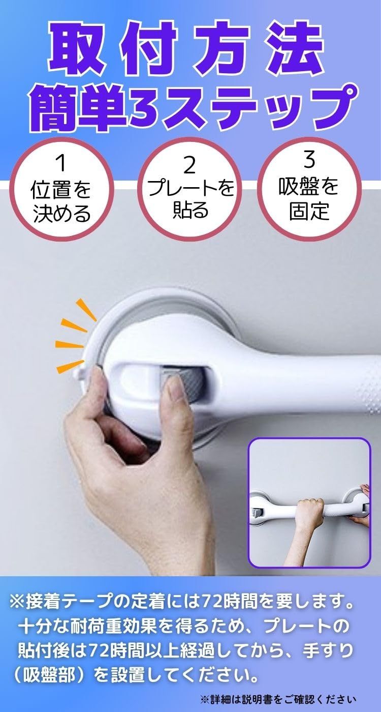 ■穴を開けずに簡単設置 付属の「当社オリジナル・アクリルプレート」を壁に貼るだけ。プレート表面が吸盤にぴったりフィットし、壁面を傷つけずに強力固定が可能です。(※プレート貼付後、72時間以上経過してから手すりを設置してください。)