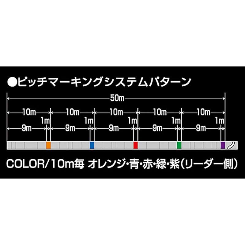 【商品概要】 巻数: 300m サイズ: 3号 (標準直径 dia.0.285mm) / 最大強力: MAX.48lb (21.8kg) / 平均強力: AVE.45lb (20.4kg) カラー: ライトグレー+5色ピッチマーキングシステム (各10m間隔 ベース ライトグレー 9m + 単色カラーマーキング 1m / カラーマーキングは "オレンジ・青・赤・緑・紫"の順番でカラーローテーション) 素材: PEライン(原糸 ポリエチレン・IZANAS) 8本組 / 生産国: 日本 シリーズ名: