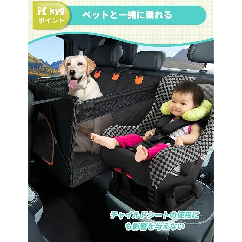 【ペットと一緒に後部座席に乗れる】従来のドライブシート(底板入り)と異なり、飼い主がペットと並んで後部座席に同乗可能。チャイルドシートの使用にも影響を与えないため、子育て世代も安心!